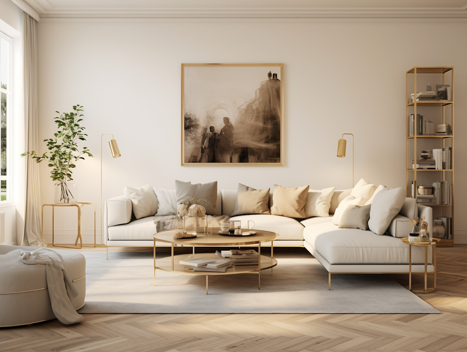 Elegant living room with white L-shaped sofa, gold accents, abstract art, and natural light. Cozy and modern interior design.