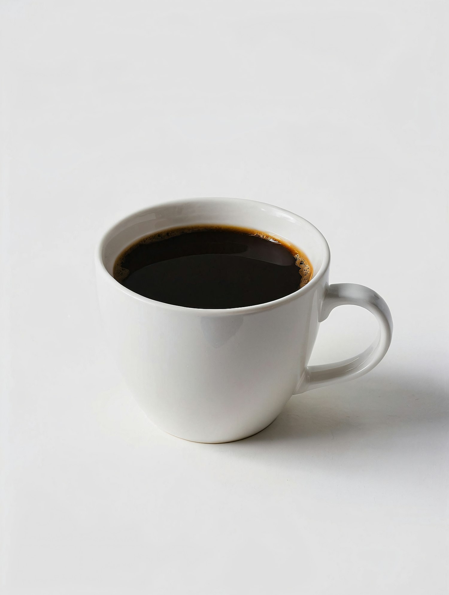 Minimalist white mug filled with fresh black coffee on a clean white background. Perfect for coffee lovers and simple aesthetics.