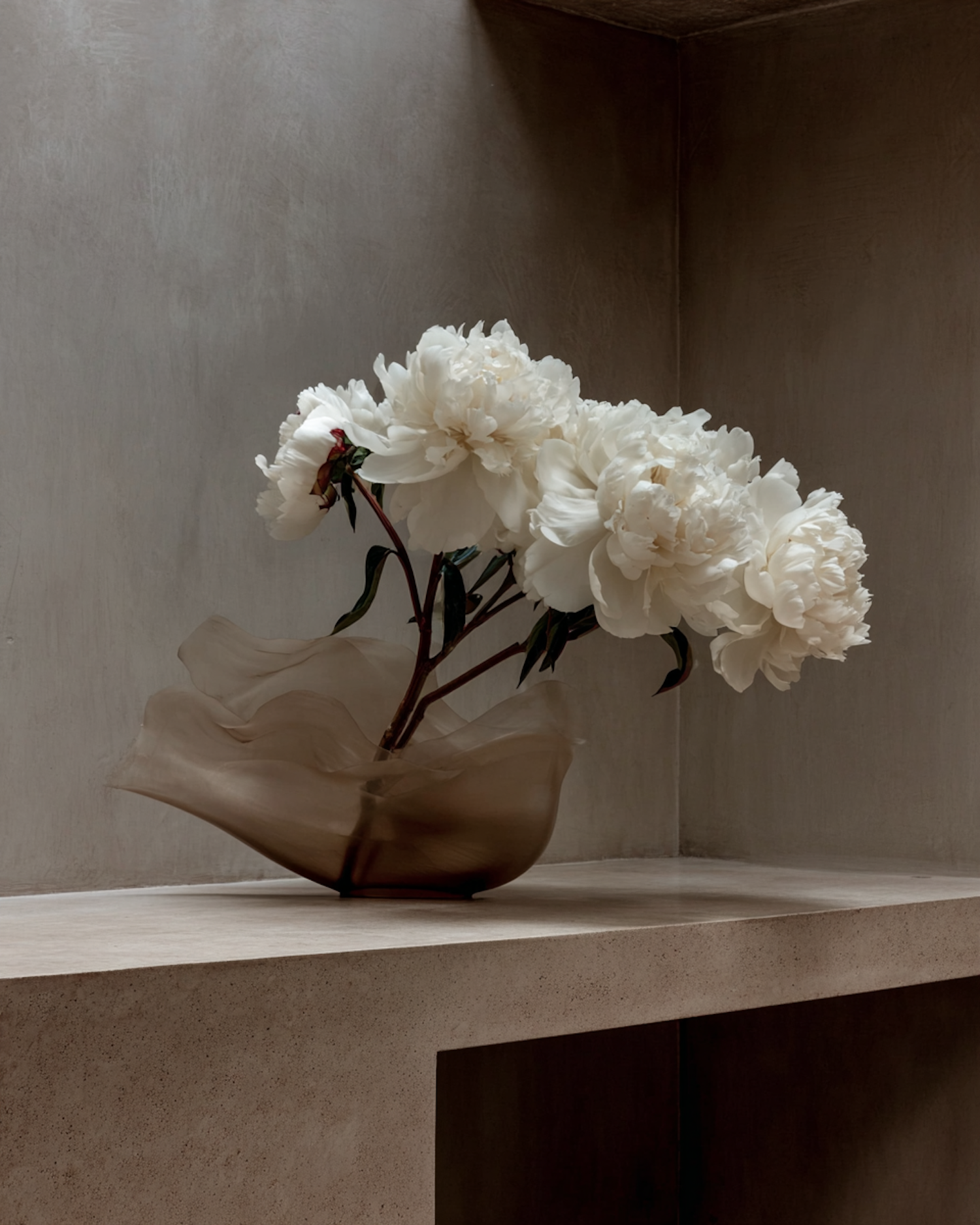 Elegant white peonies in a translucent vase on a stone surface, set against a neutral-toned wall with soft lighting.