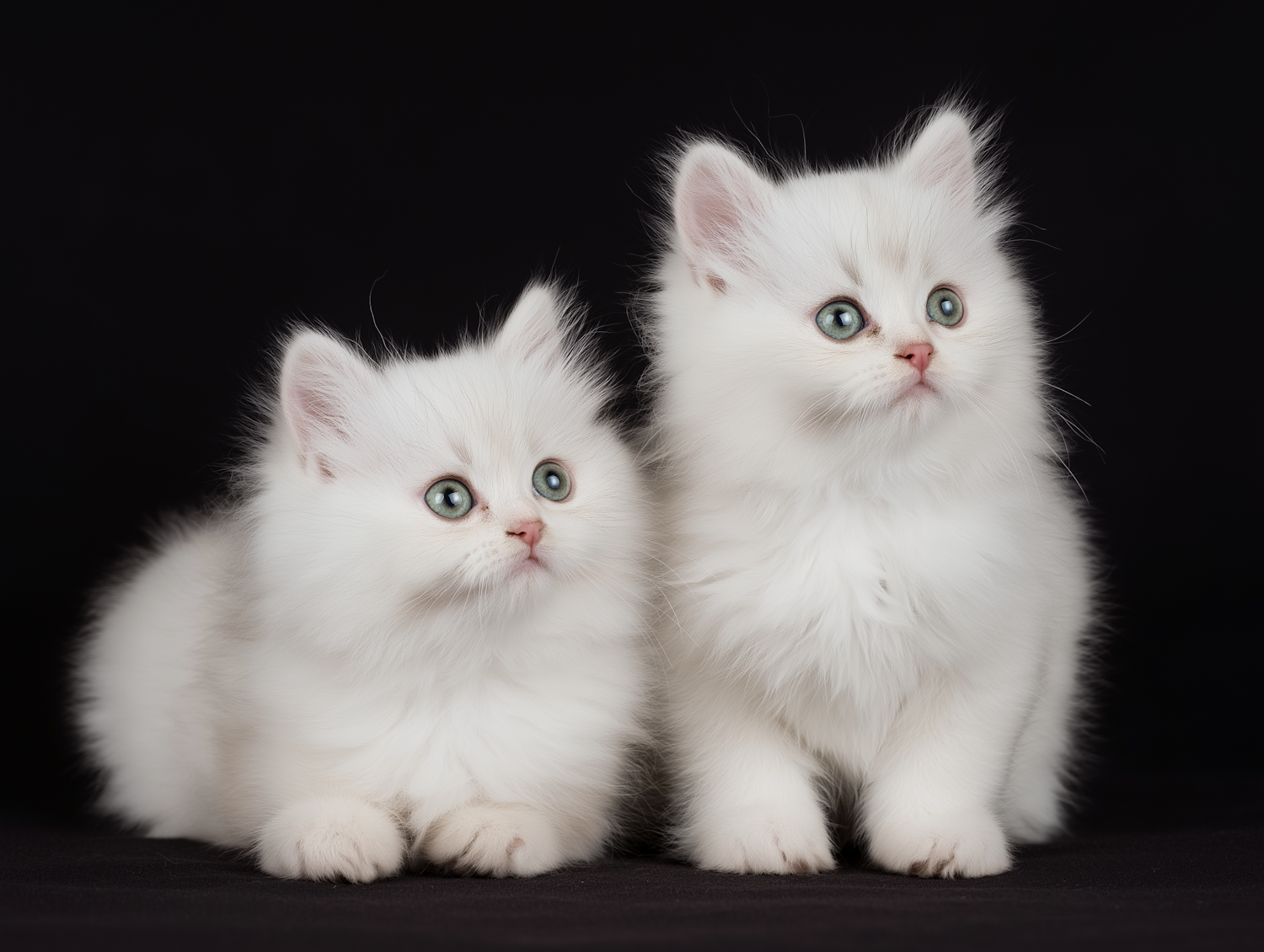 Beautiful white Persian kittens with fluffy fur and vivid blue eyes sit side by side on a black background.