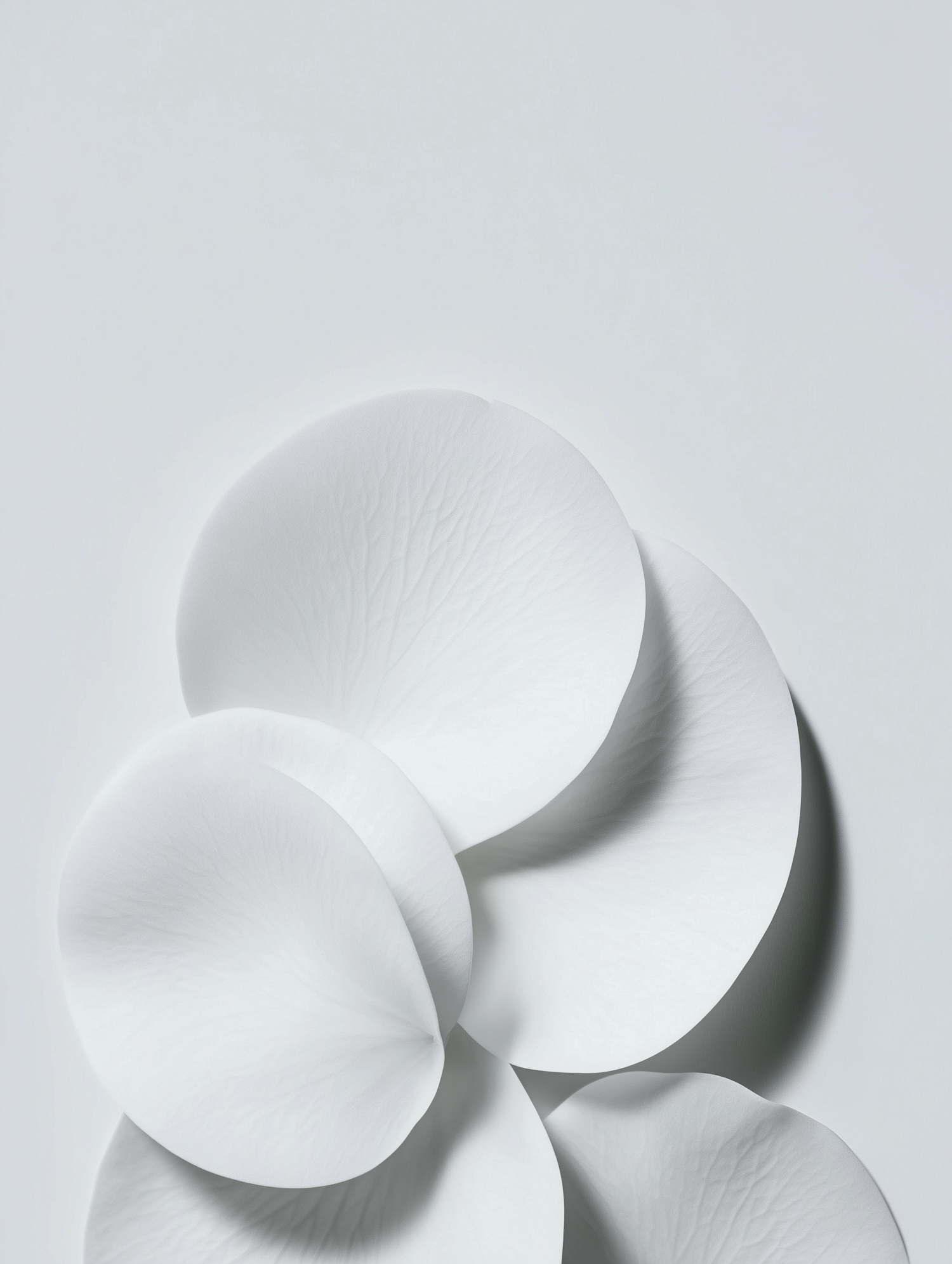 Close-up of white flower petals with soft textures and subtle veins, arranged in a layered pattern against a light gray background.