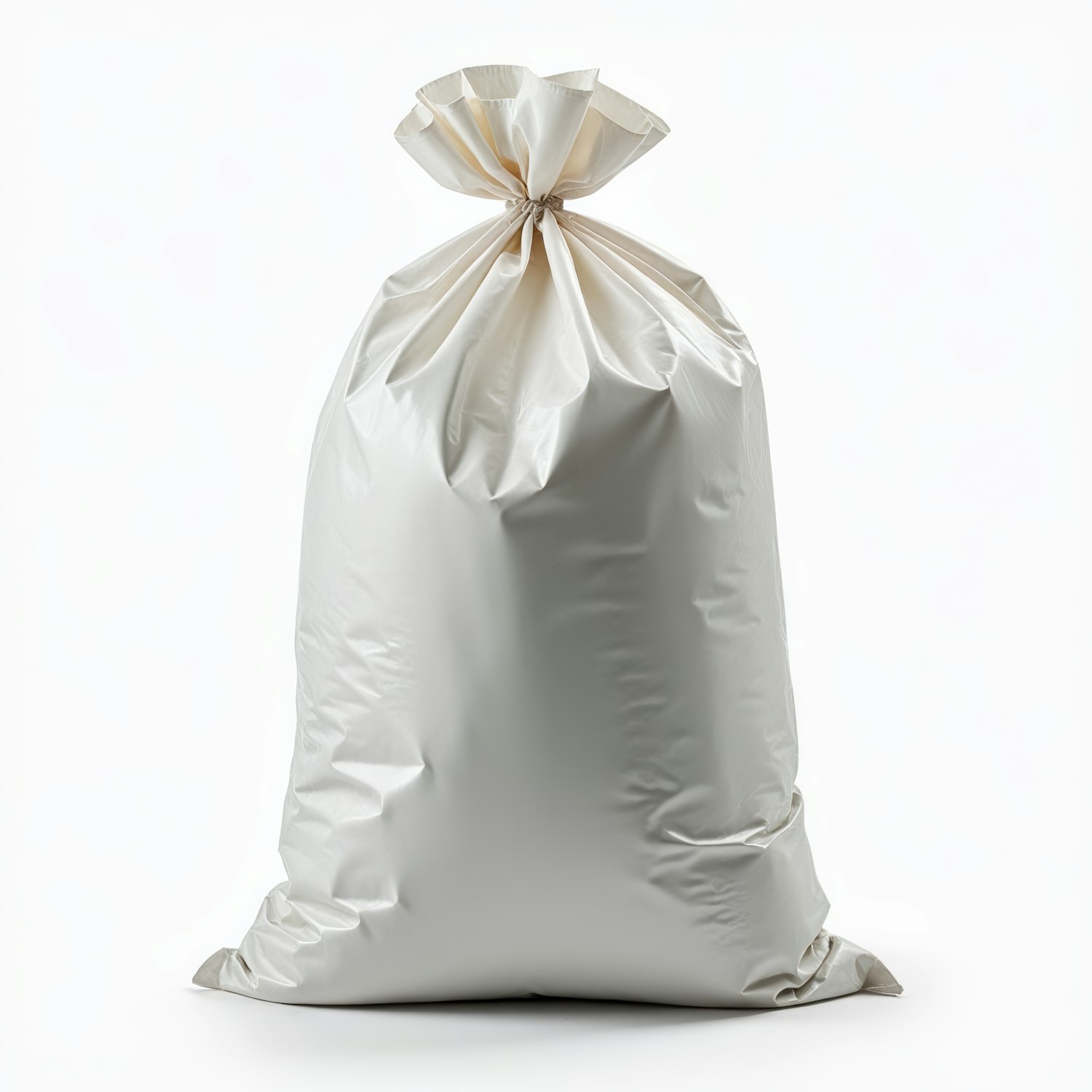 A filled white plastic garbage bag with a tied top, set against a plain white background.