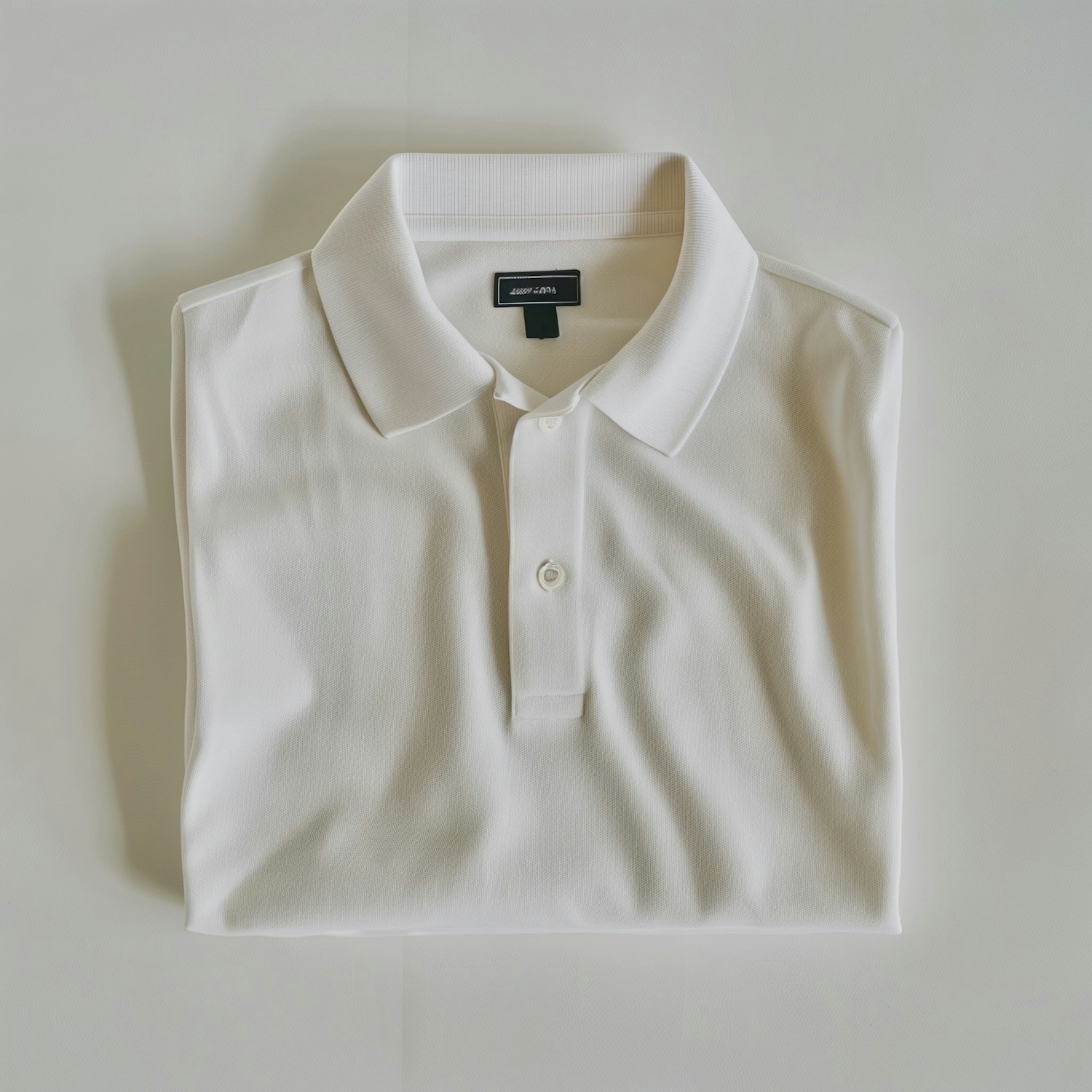 Crisp white polo shirt with a classic design, neatly folded on a light surface. Features a ribbed collar, two-button placket, and black tag detail.