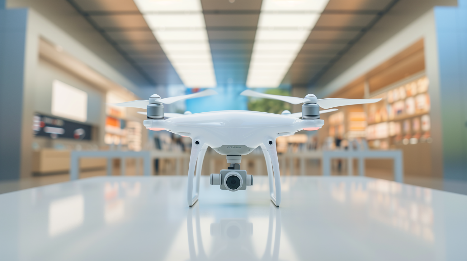 Sleek white drone with camera on display in a modern store, highlighting its design and technology in a bright setting.