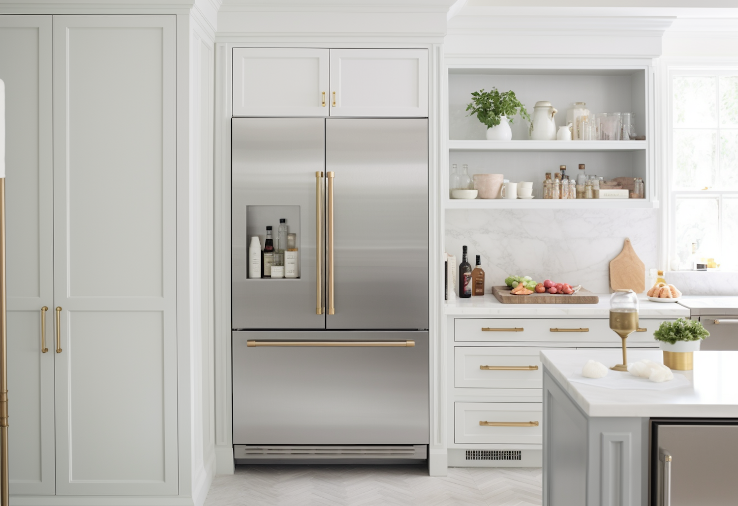 Modern kitchen with stainless steel fridge, gold accents, marble backsplash, and open shelving for a bright, elegant design.