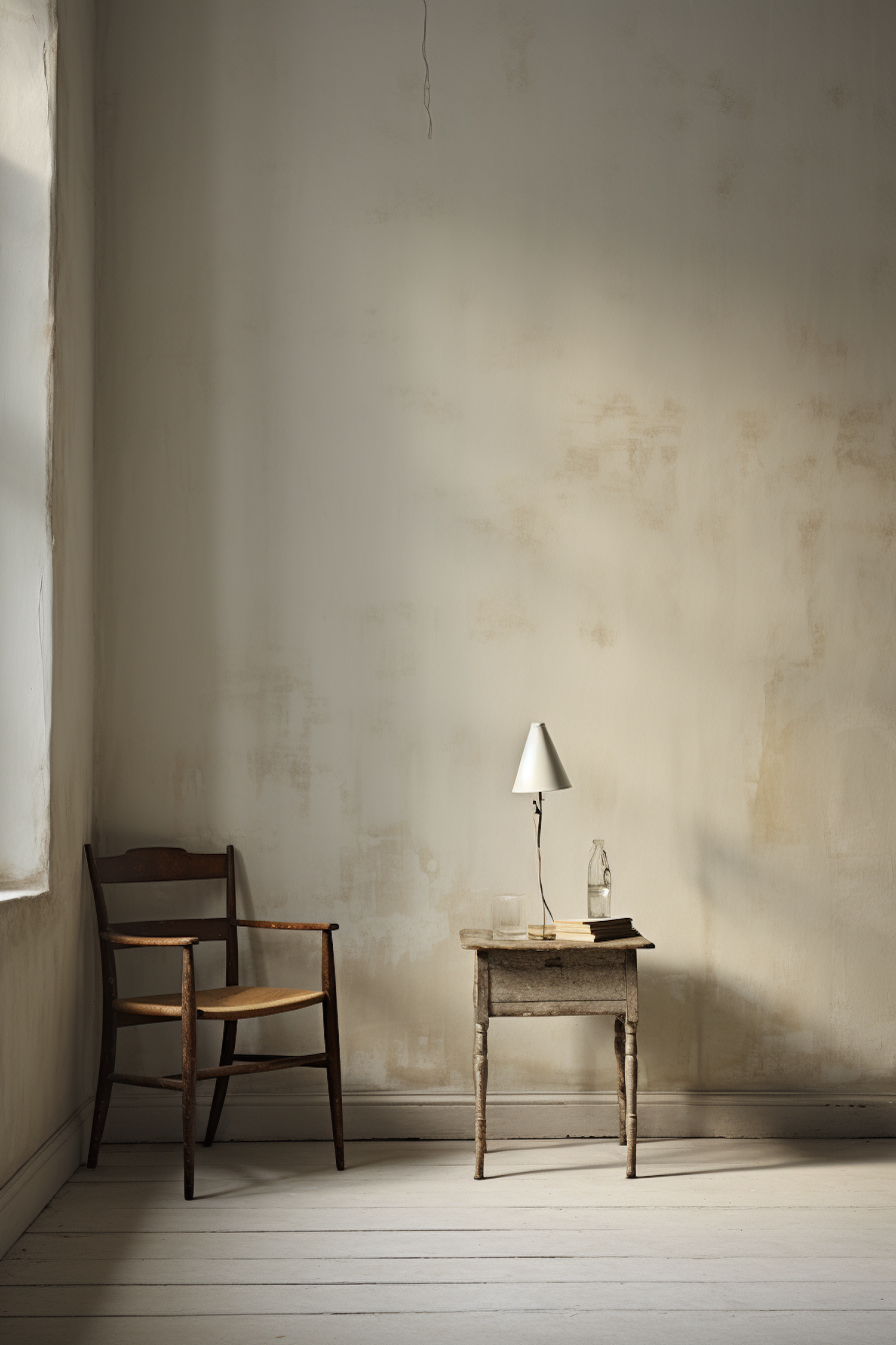 Minimalist room with rustic chair, wooden table, lamp, and books. Soft natural light creates a serene atmosphere.