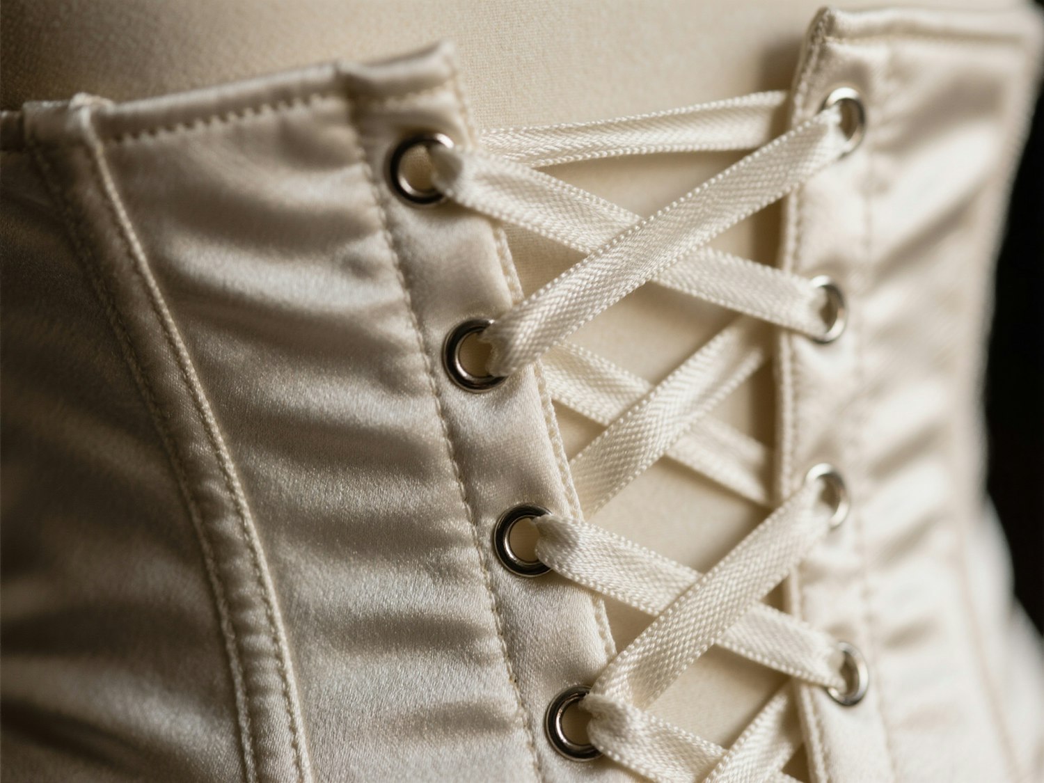 Close-up of a white satin corset with intricate lacing and metal eyelets, highlighting its elegant design and smooth texture.