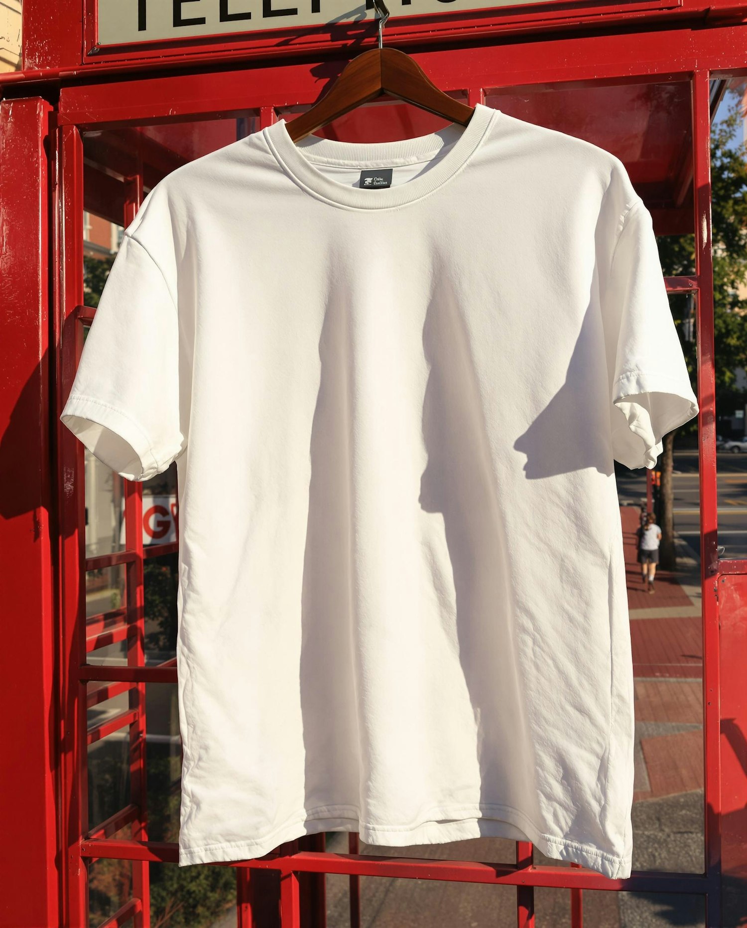 A white T-shirt on a wooden hanger, displayed against a vintage red telephone booth under sunlight, with a street scene in the background.