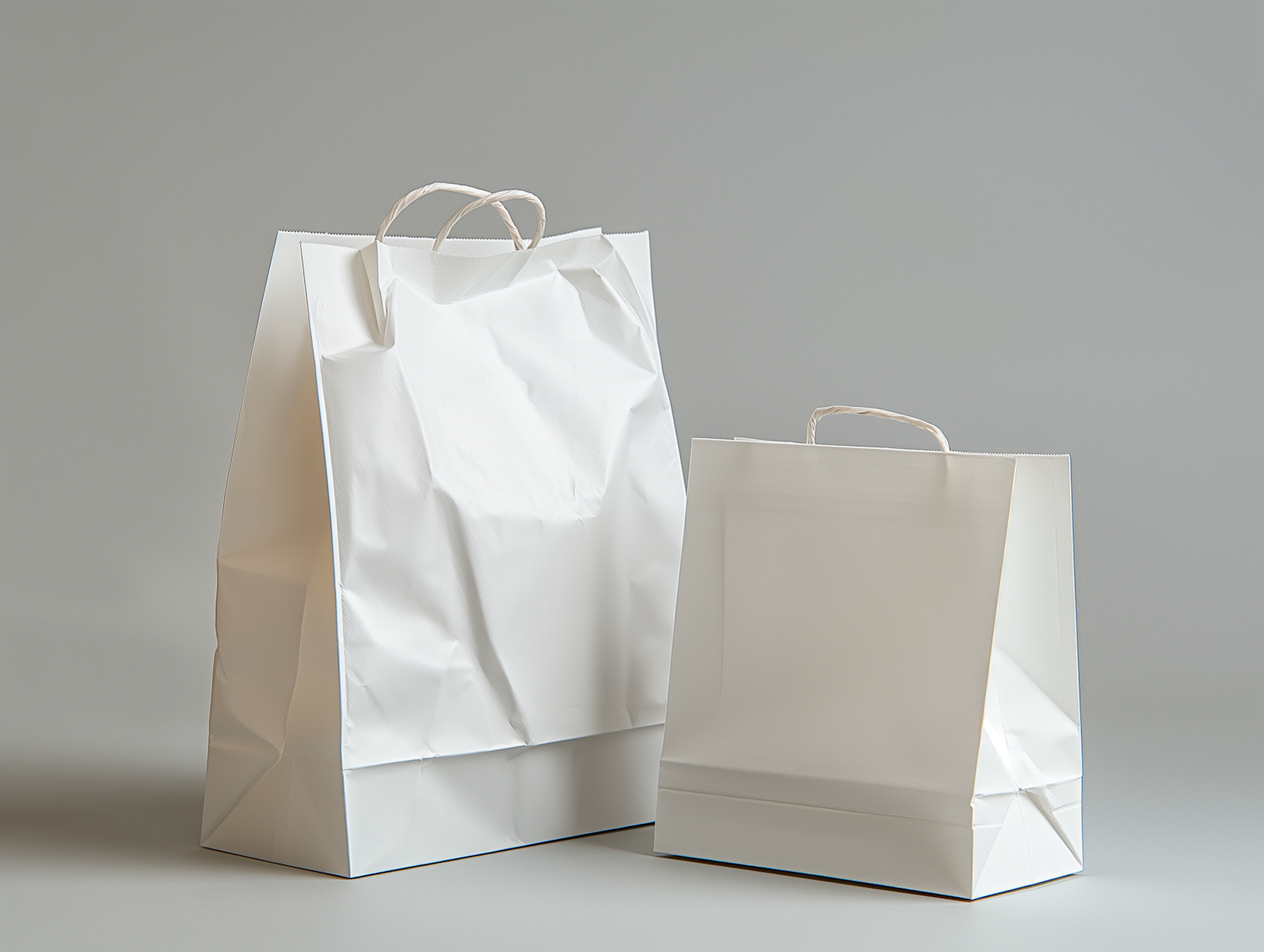 Two white paper bags with twisted handles on a neutral background, showcasing minimalistic design and subtle texture.