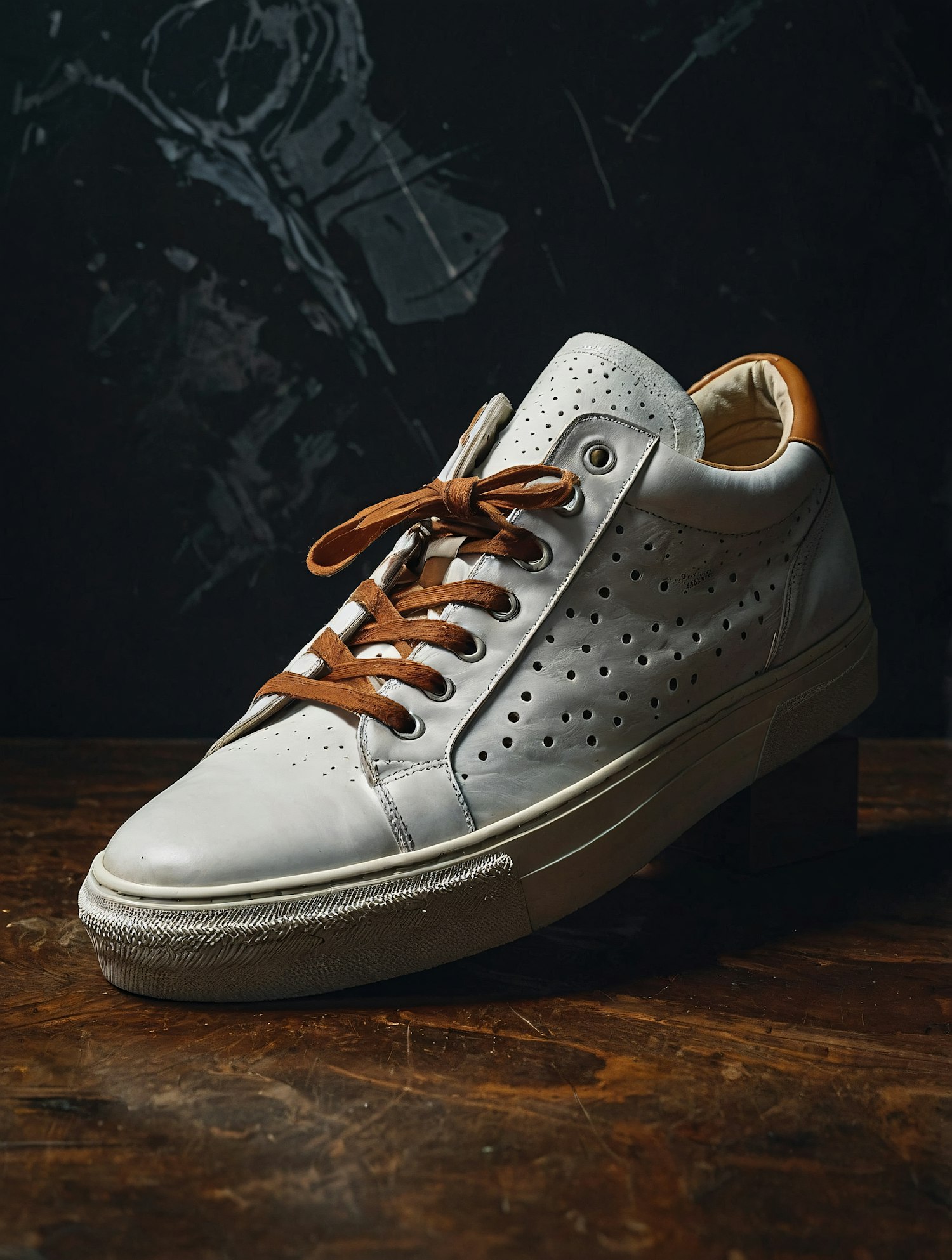 Elegant white leather sneaker with brown laces and perforated design, set against a dark background for a stylish look.