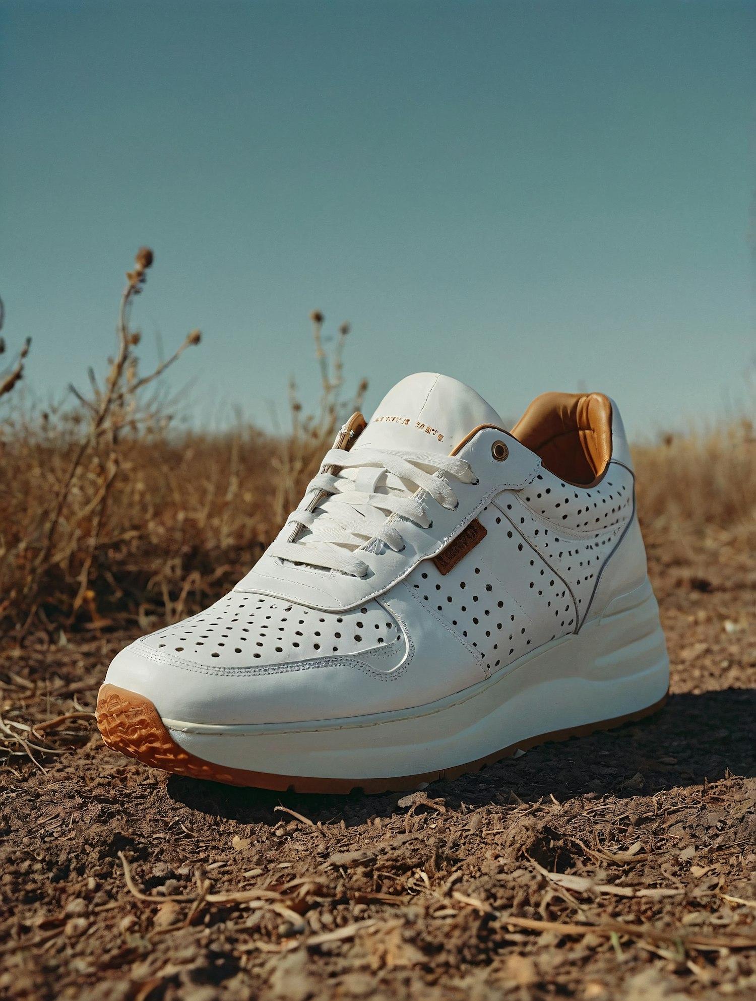 Stylish white sneaker with perforated design on a natural background, featuring brown sole accents and clear blue sky.