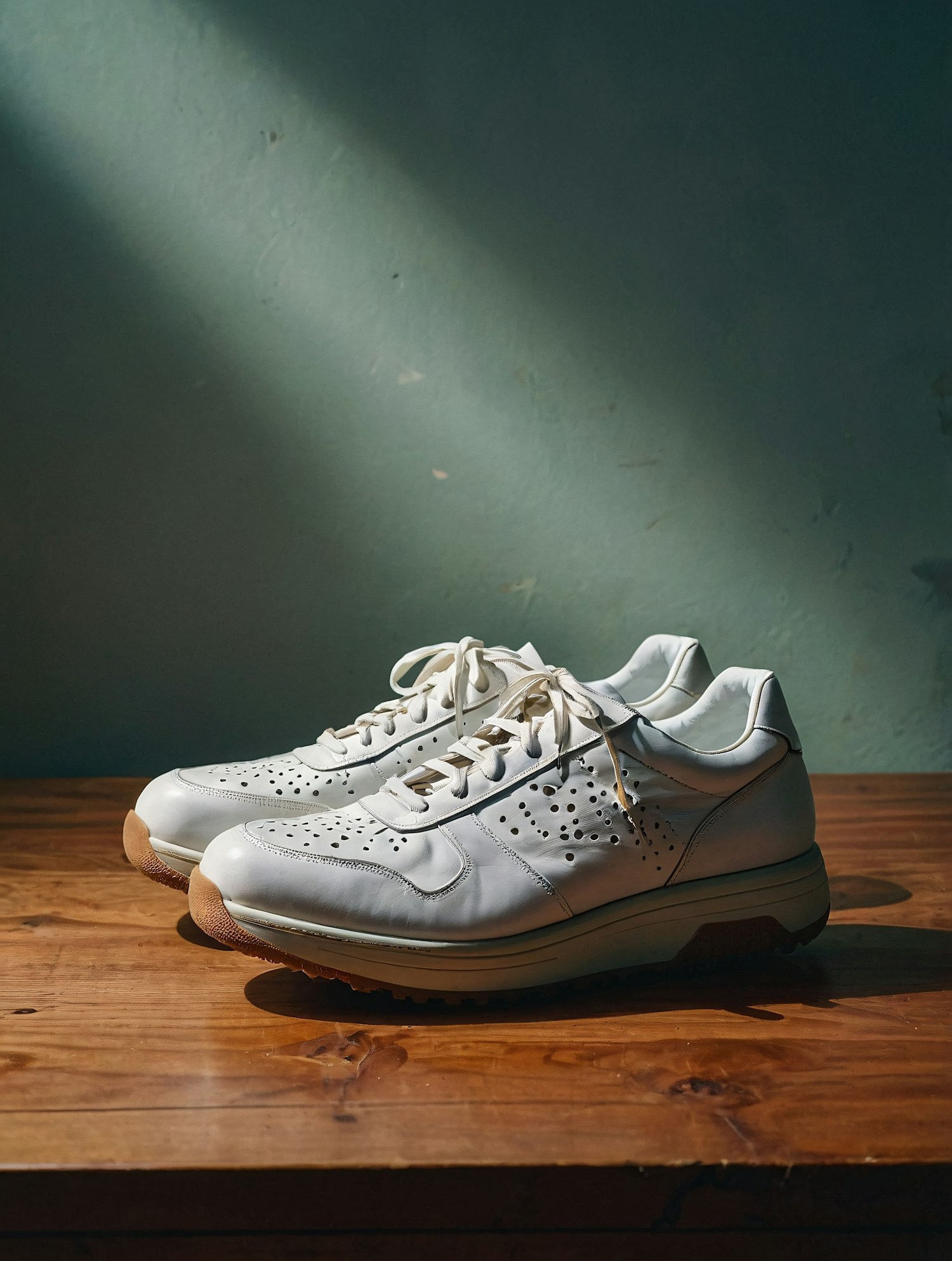 Minimalist white leather sneakers with perforated sides on a rustic wooden surface, softly lit by natural light against a green wall.