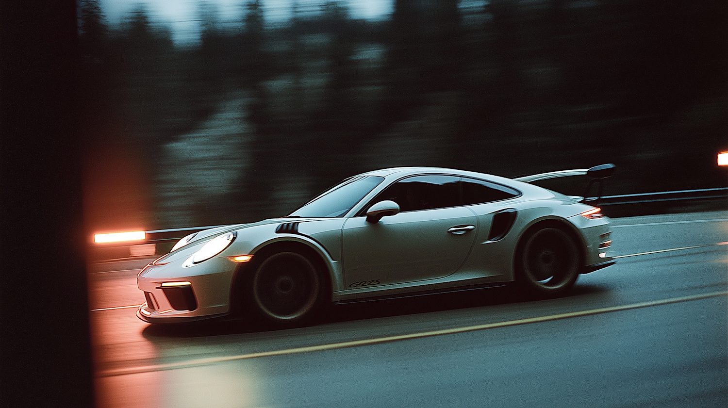 A white Porsche 911 GT2 RS speeding on a dimly lit road, showcasing its sleek design and high-performance features.