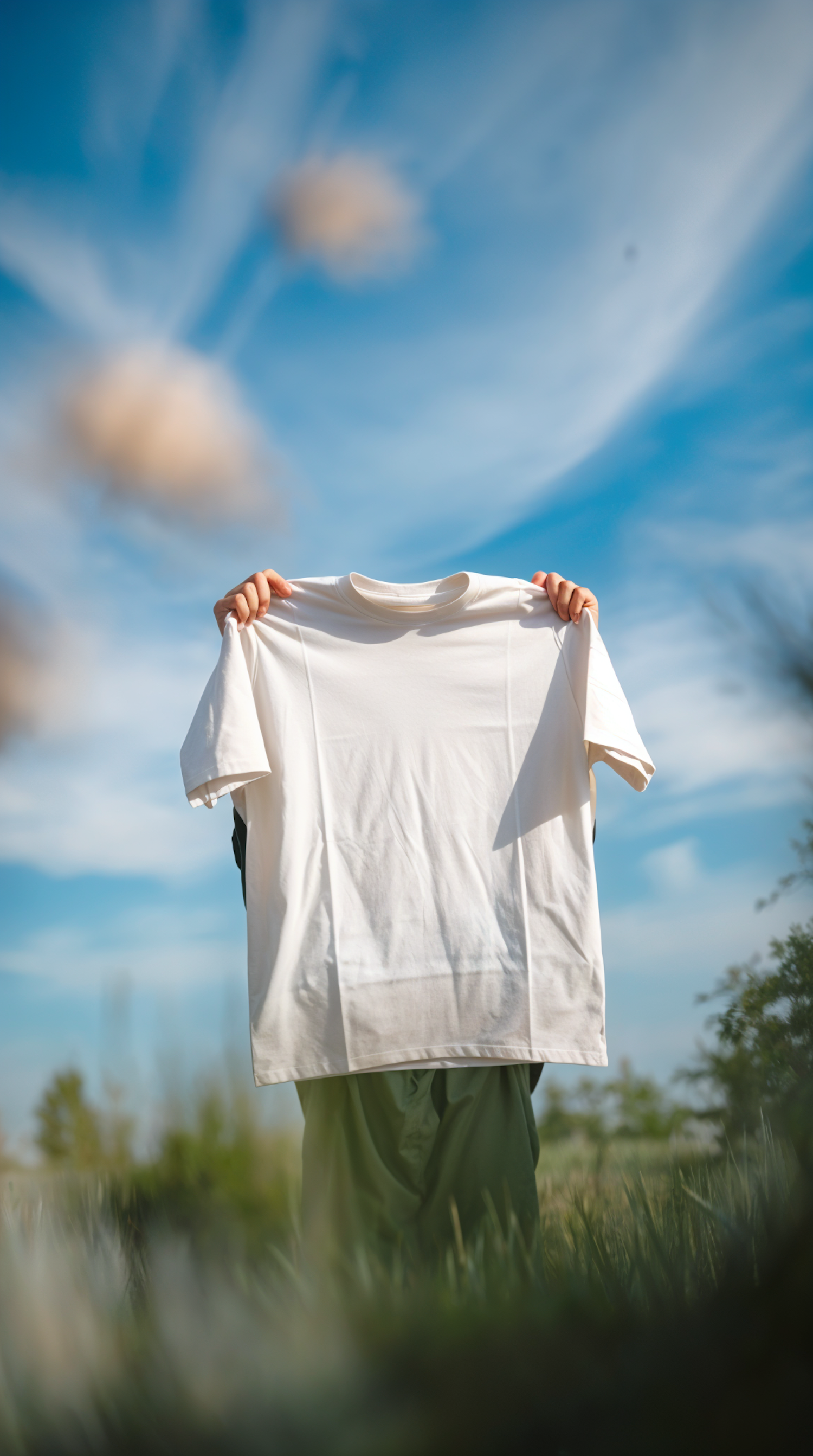 Person holding a white T-shirt in a grassy field under a bright blue sky with wispy clouds.