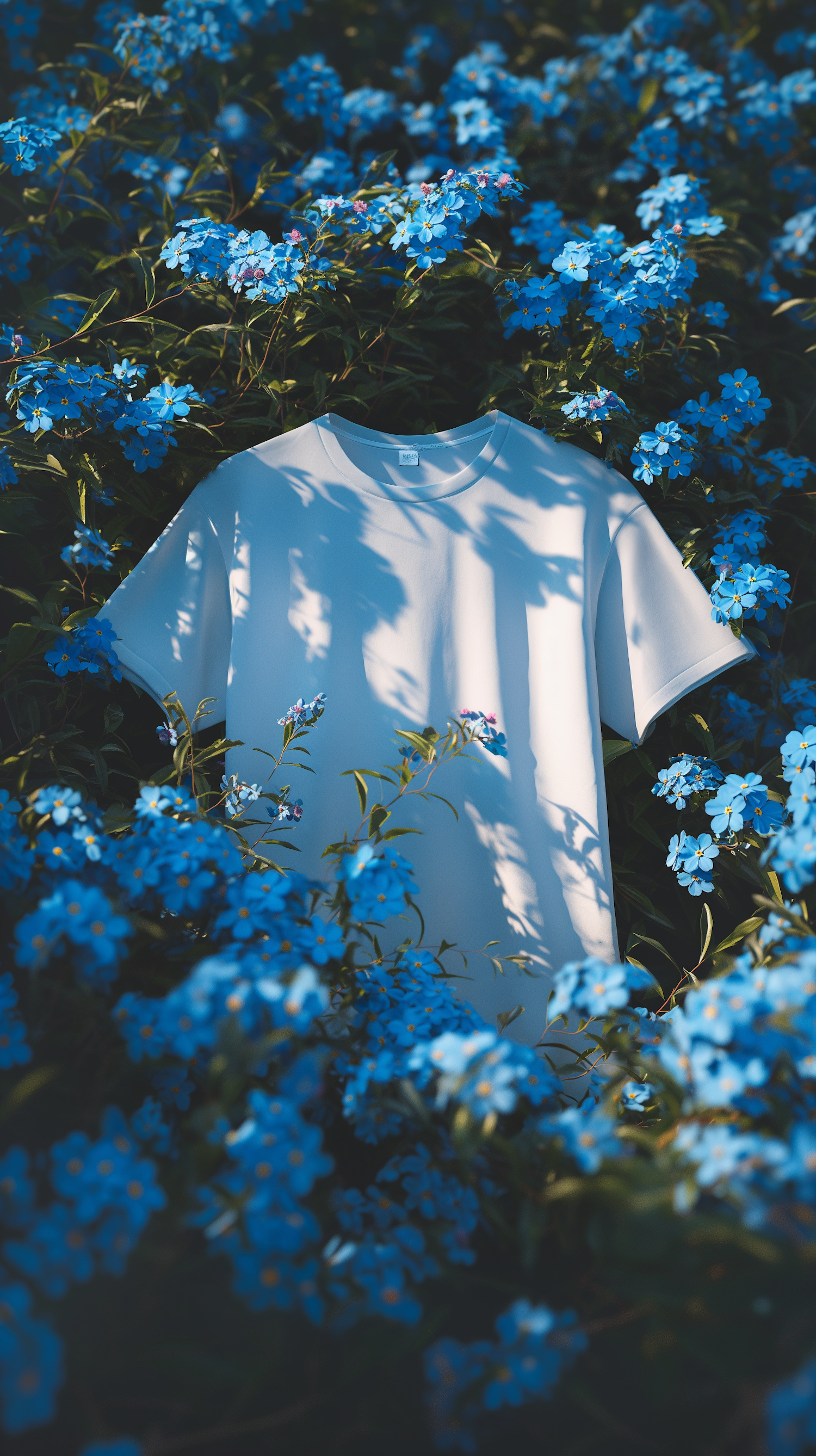 White t-shirt amidst vibrant blue flowers, creating a striking contrast with sunlight casting intricate shadows.