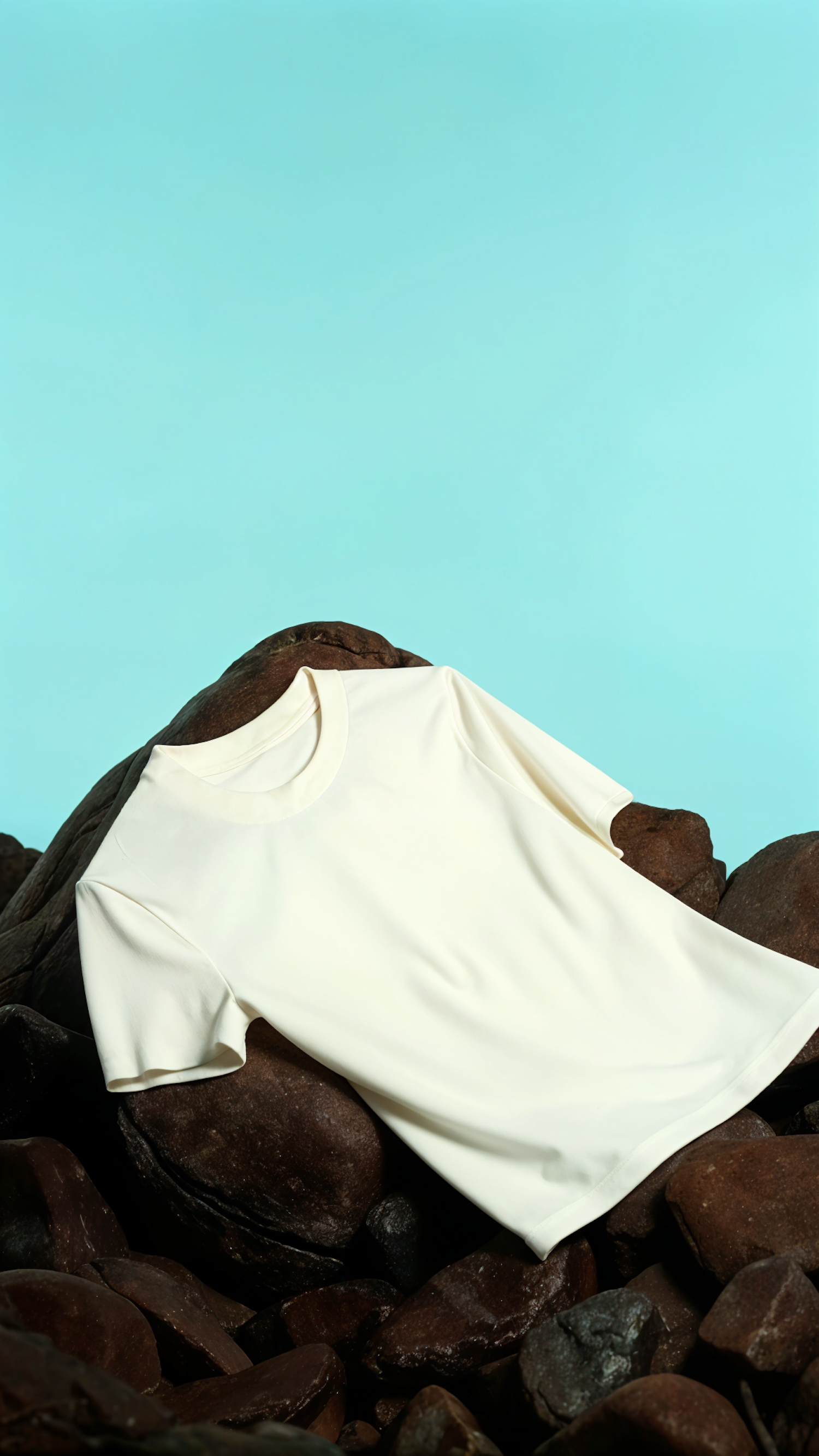Minimalist image of a white T-shirt on dark rocks against a turquoise background, highlighting texture and contrast.