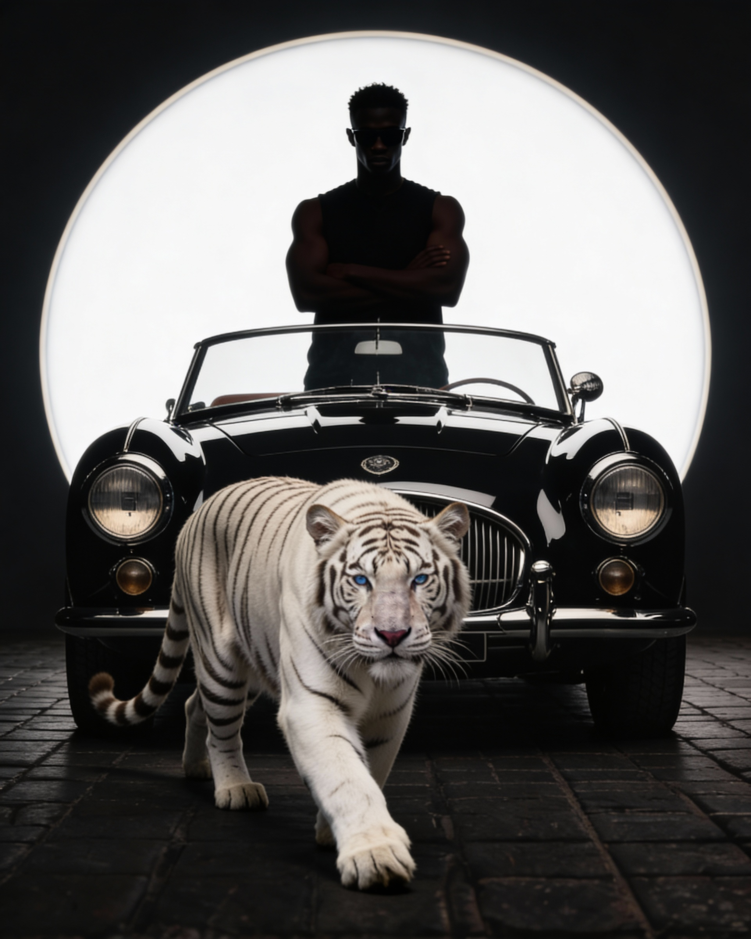 A white tiger strides in front of a classic car with a silhouetted figure behind, set against a dramatic circular light.