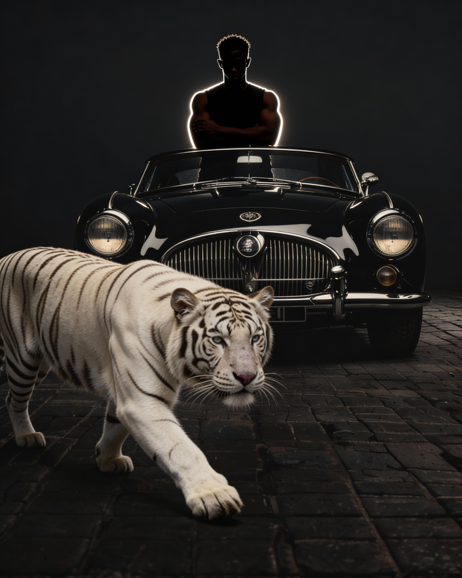 A white tiger strides in front of a vintage black car with a silhouetted figure standing inside, creating a dramatic and striking composition.