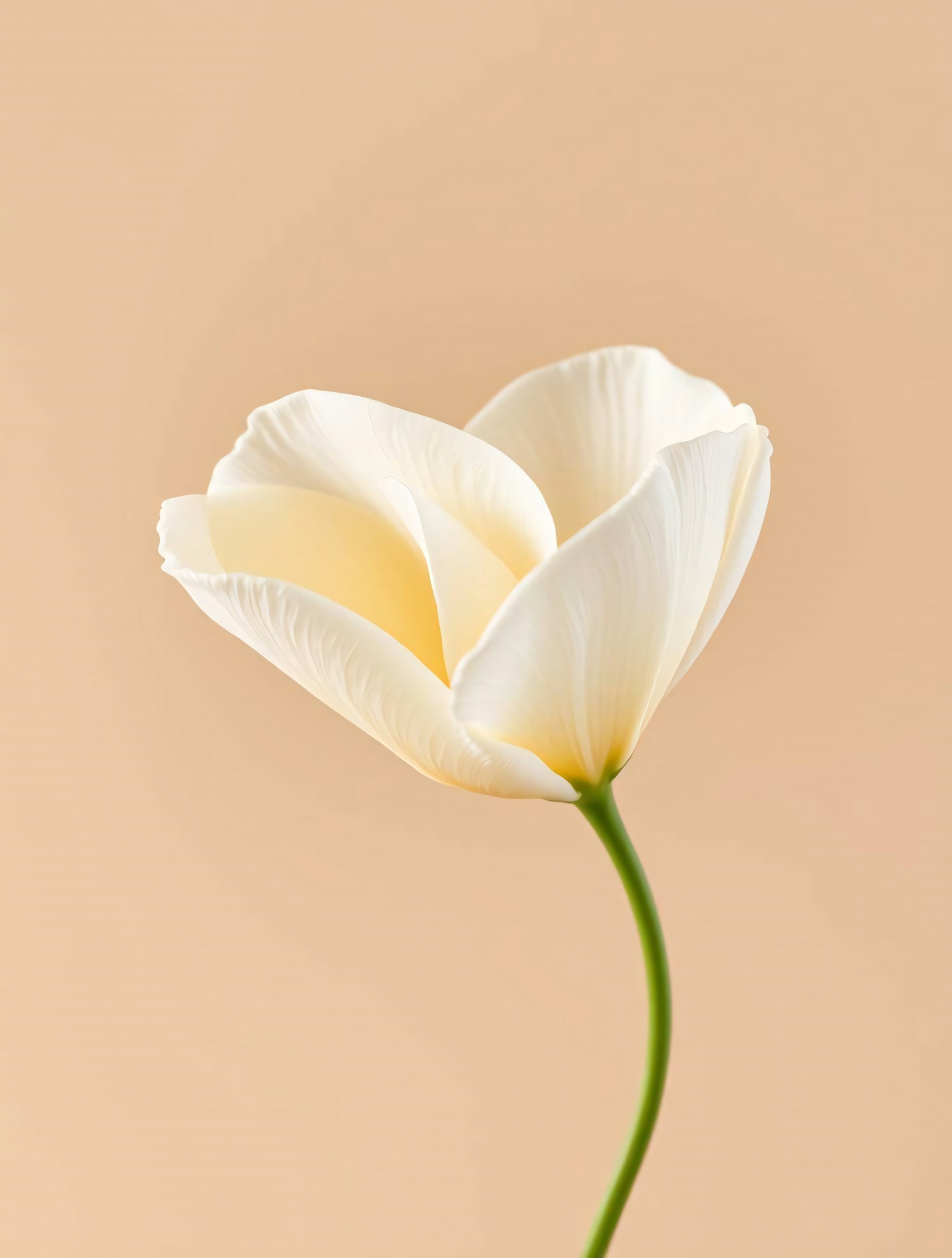 Minimalist close-up of a white tulip with soft yellow tones, set against a smooth beige background. Perfect for nature and floral lovers.