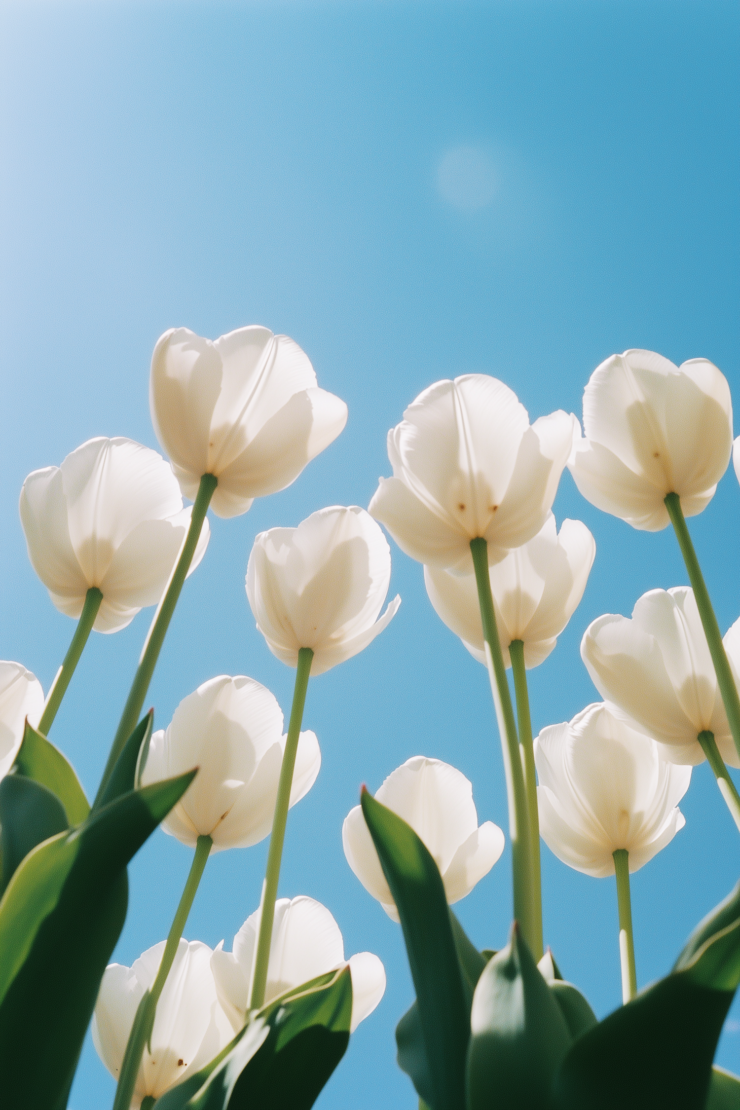 Upward view of white tulips in full bloom against a bright blue sky, showcasing their delicate petals and vibrant green stems.