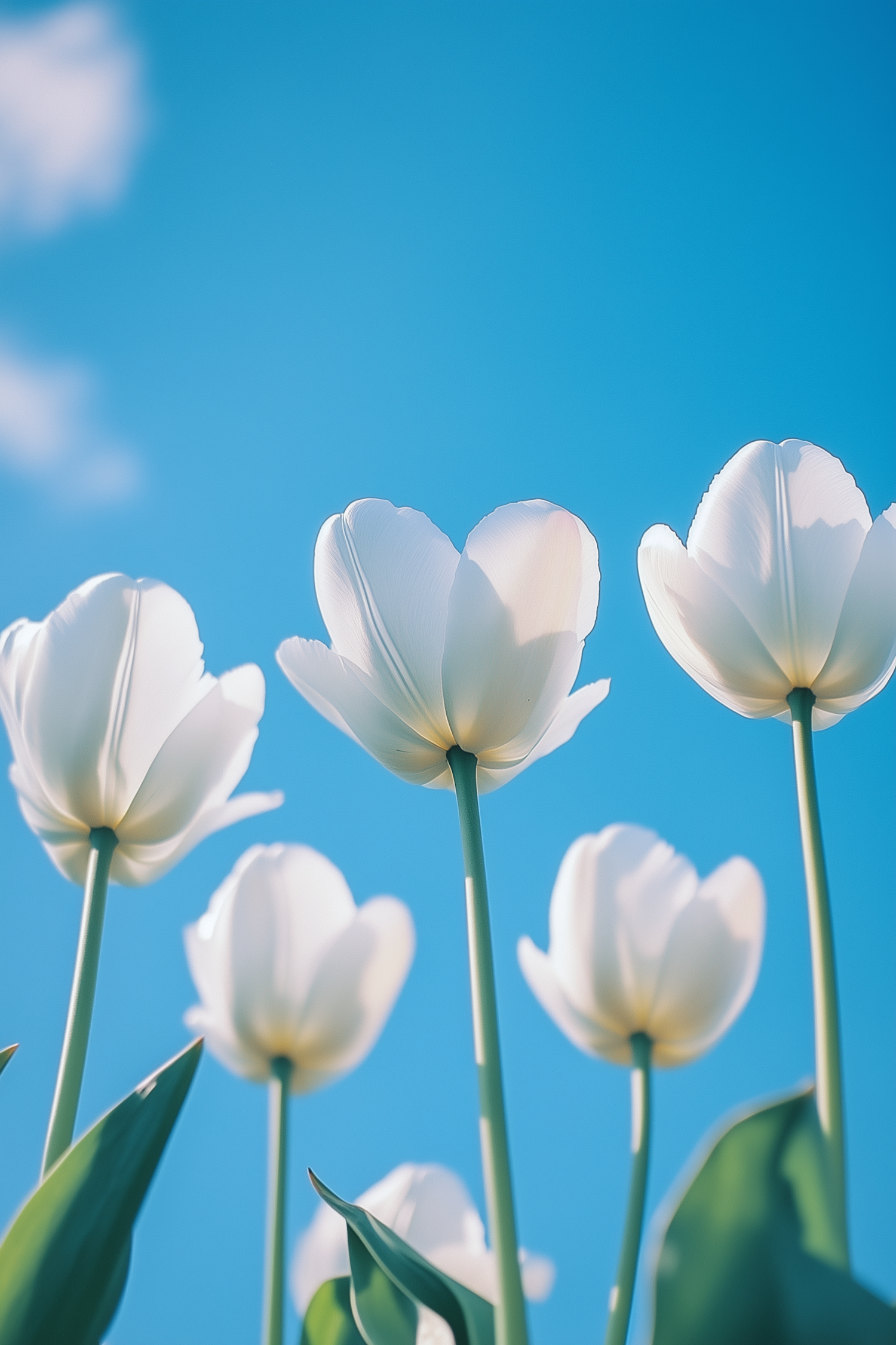 Close-up of white tulips against a bright blue sky, with soft sunlight highlighting their delicate petals and green stems.