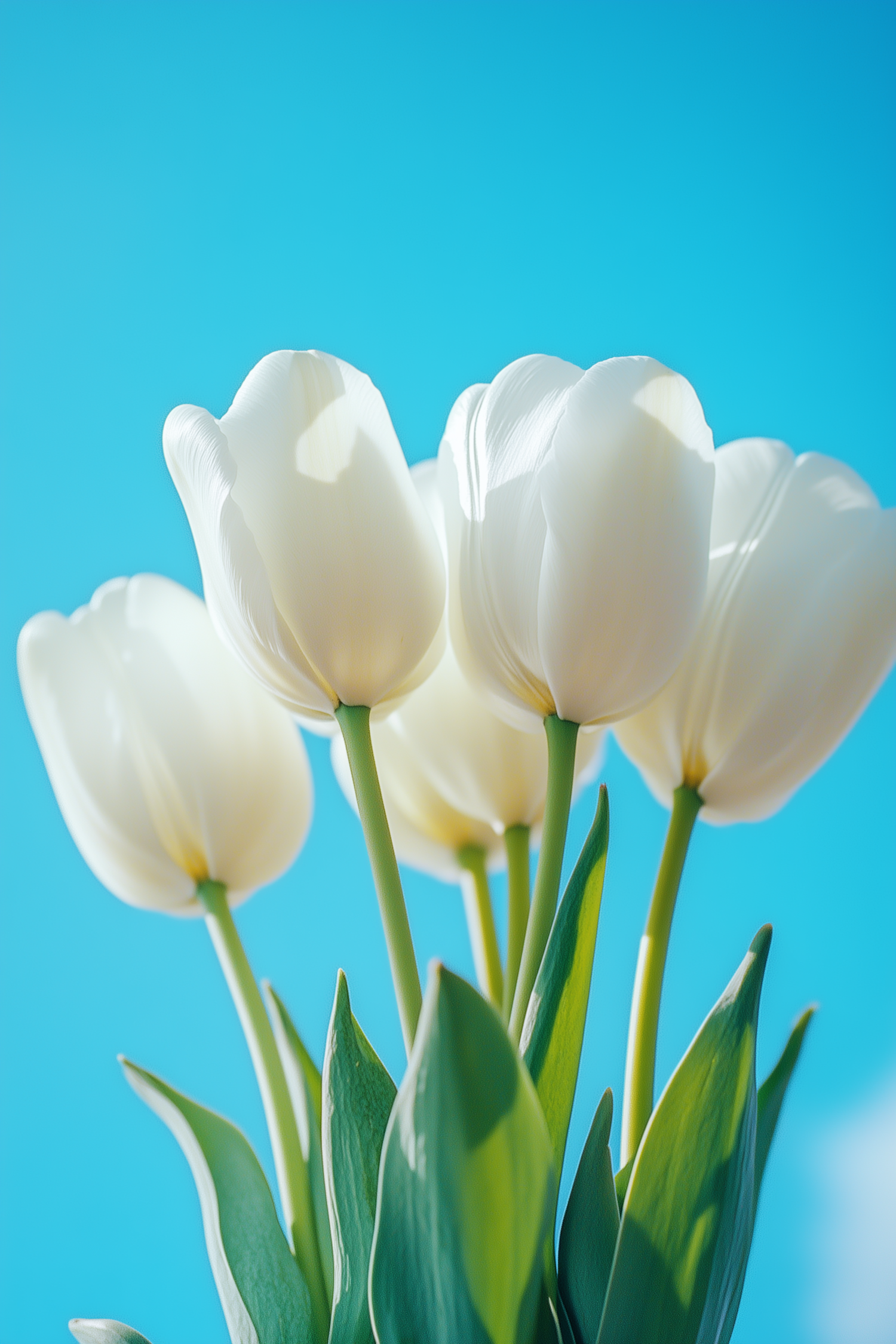 Bright white tulips with green stems against a vivid blue sky, creating a serene and minimalistic floral composition.