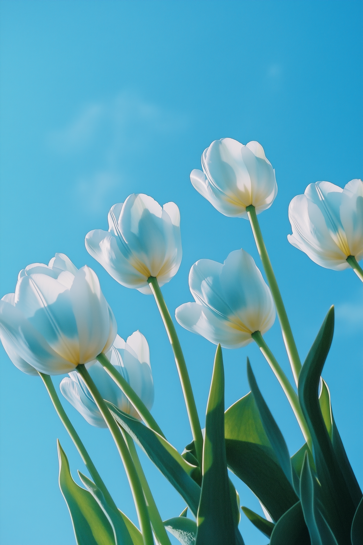White tulips bloom under a bright blue sky, their delicate petals glowing in sunlight. A serene and vibrant nature scene.