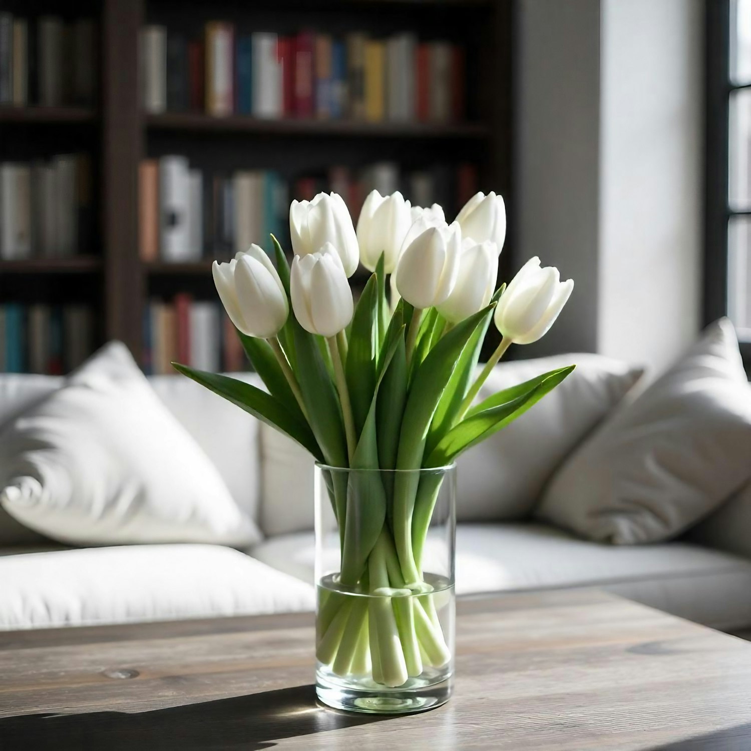 Elegant white tulips in a glass vase on a wooden table, with a cozy living room and bookshelf in the background.