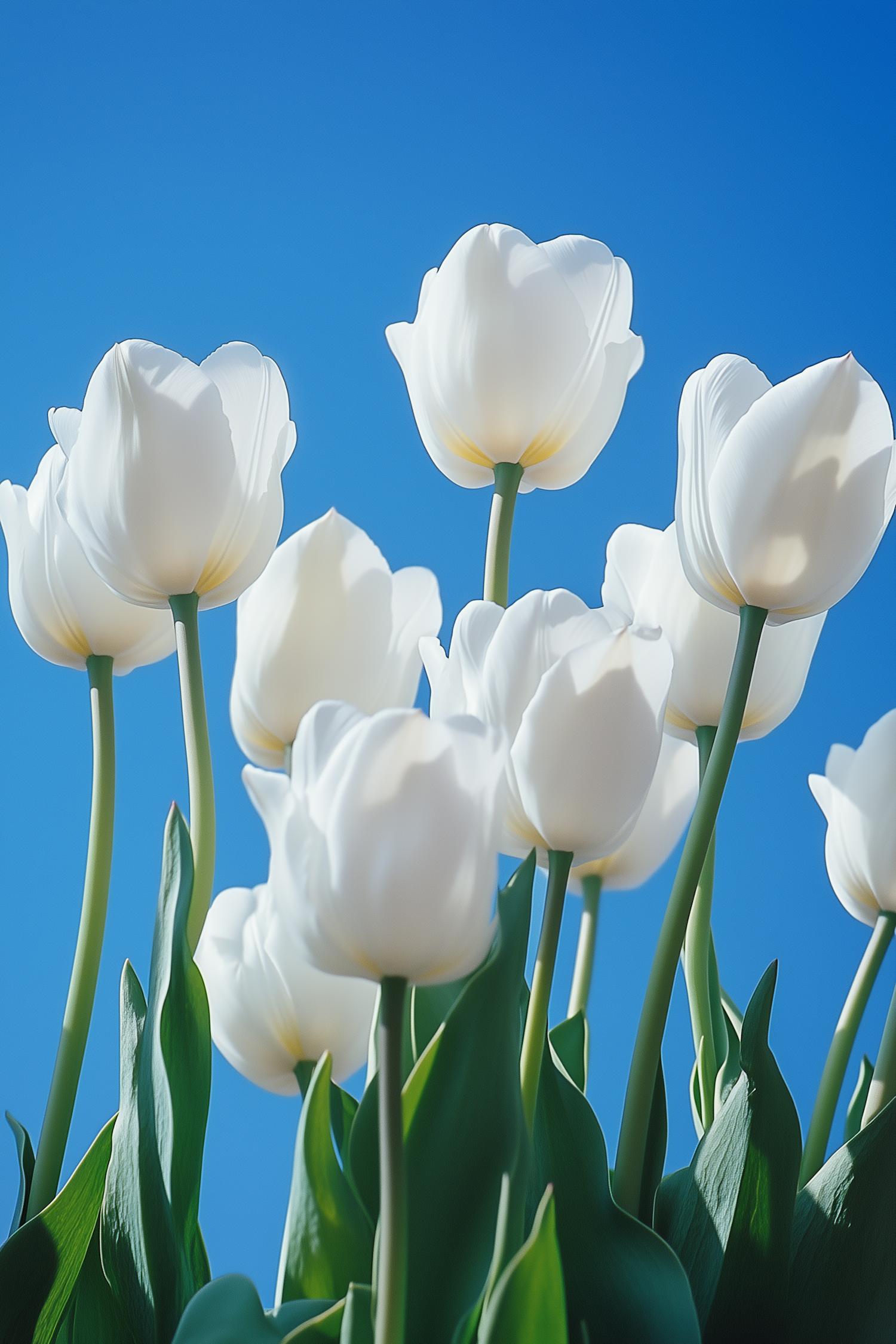 Bright white tulips in full bloom against a vivid blue sky, showcasing the beauty of spring with vibrant green stems and leaves.