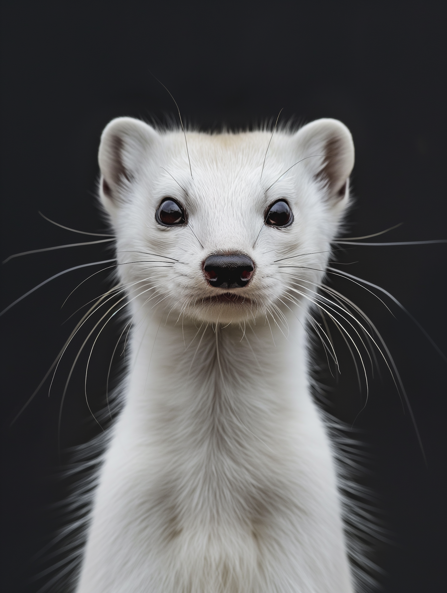 White-furred animal with blurred face, long whiskers, and dark background creates a striking contrast and visual symmetry.