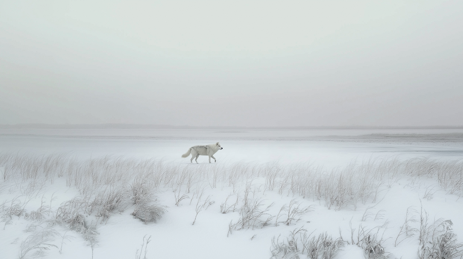 A white wolf walks across a snowy, misty landscape with frost-covered grass, creating a serene and minimalist winter scene.