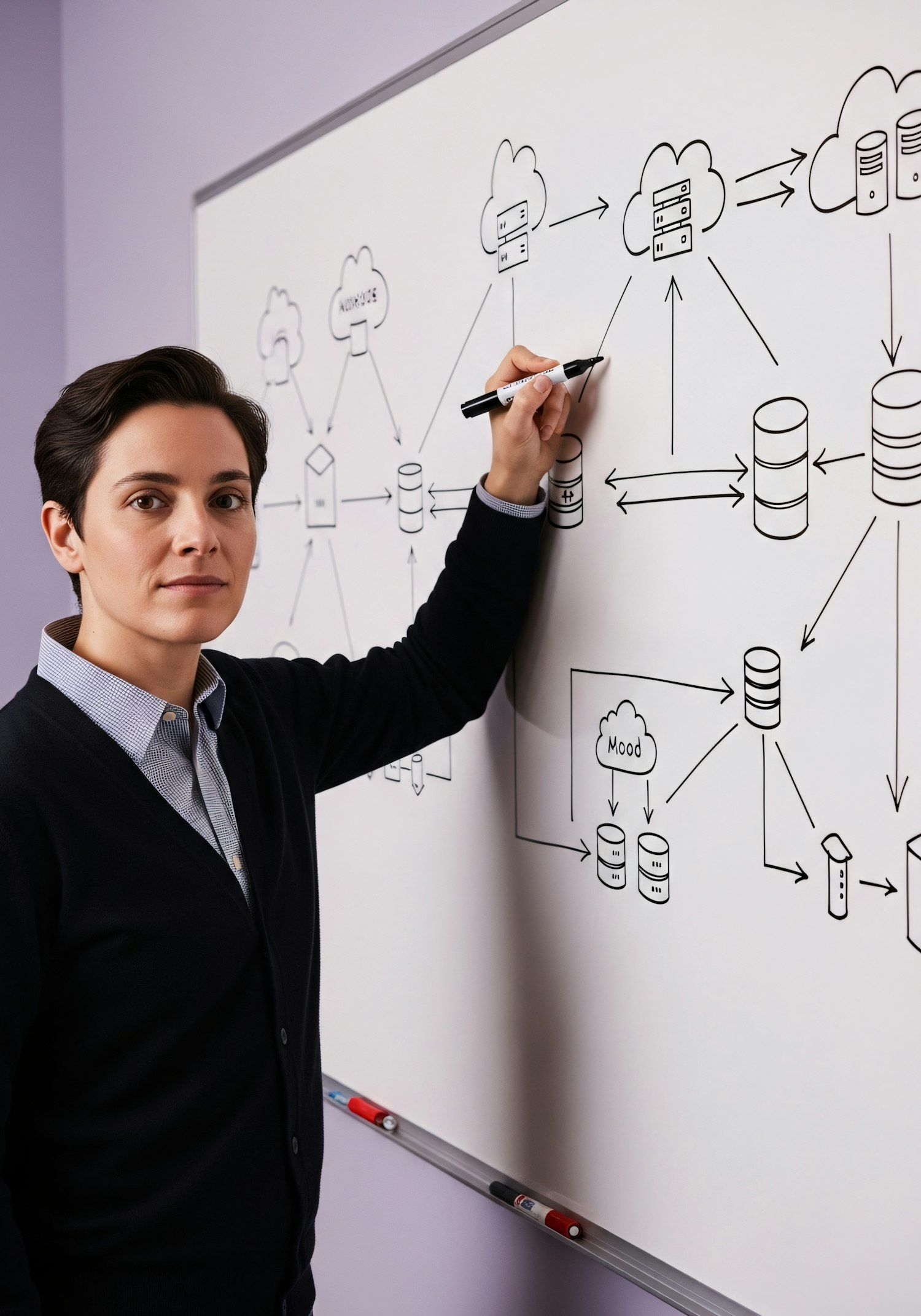 A professional explaining a complex diagram on a whiteboard, showcasing a collaborative and educational environment.