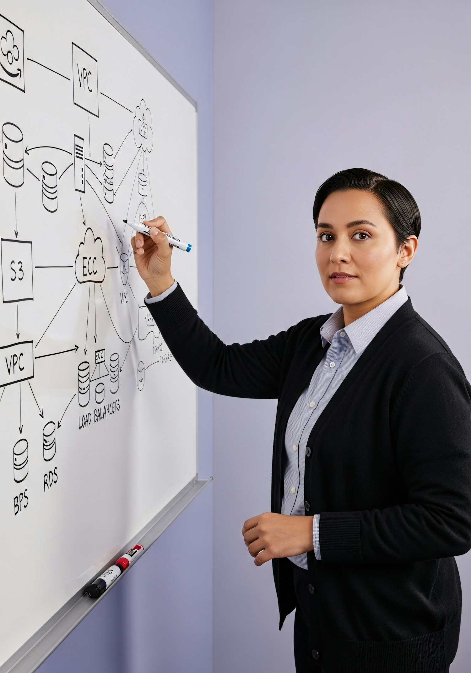 A professional explaining a network diagram on a whiteboard, showcasing a detailed and organized presentation.