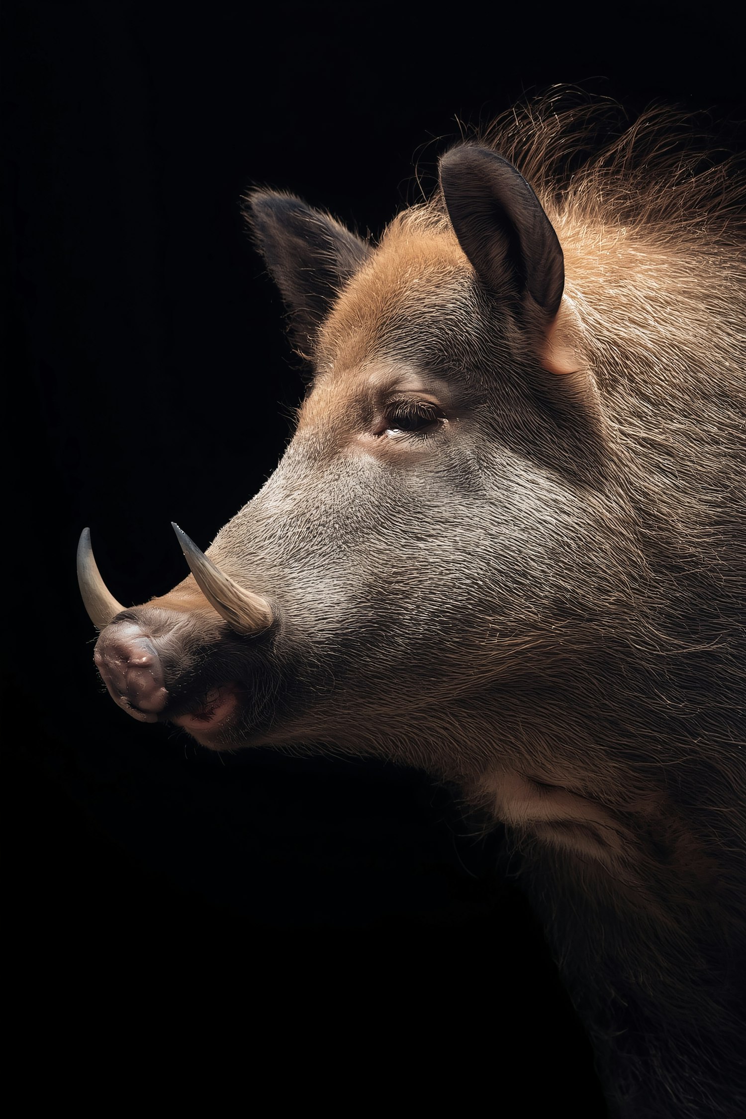 Close-up profile of a wild boar with detailed fur and tusks, set against a black background for a dramatic effect.
