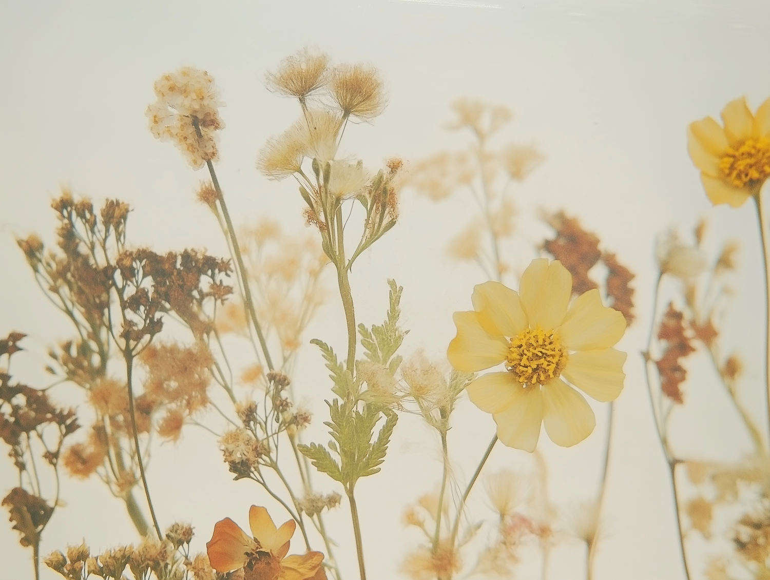 A serene arrangement of wildflowers with yellow and brown hues, featuring a prominent yellow blossom against a soft background.