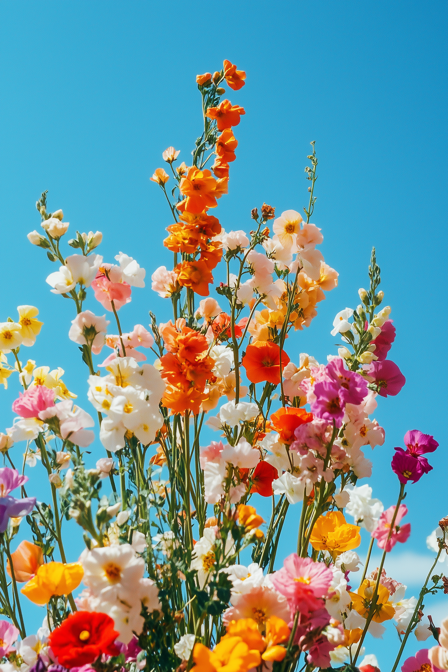 Bright wildflowers in orange, pink, yellow, and white bloom against a clear blue sky, creating a vibrant and cheerful scene.