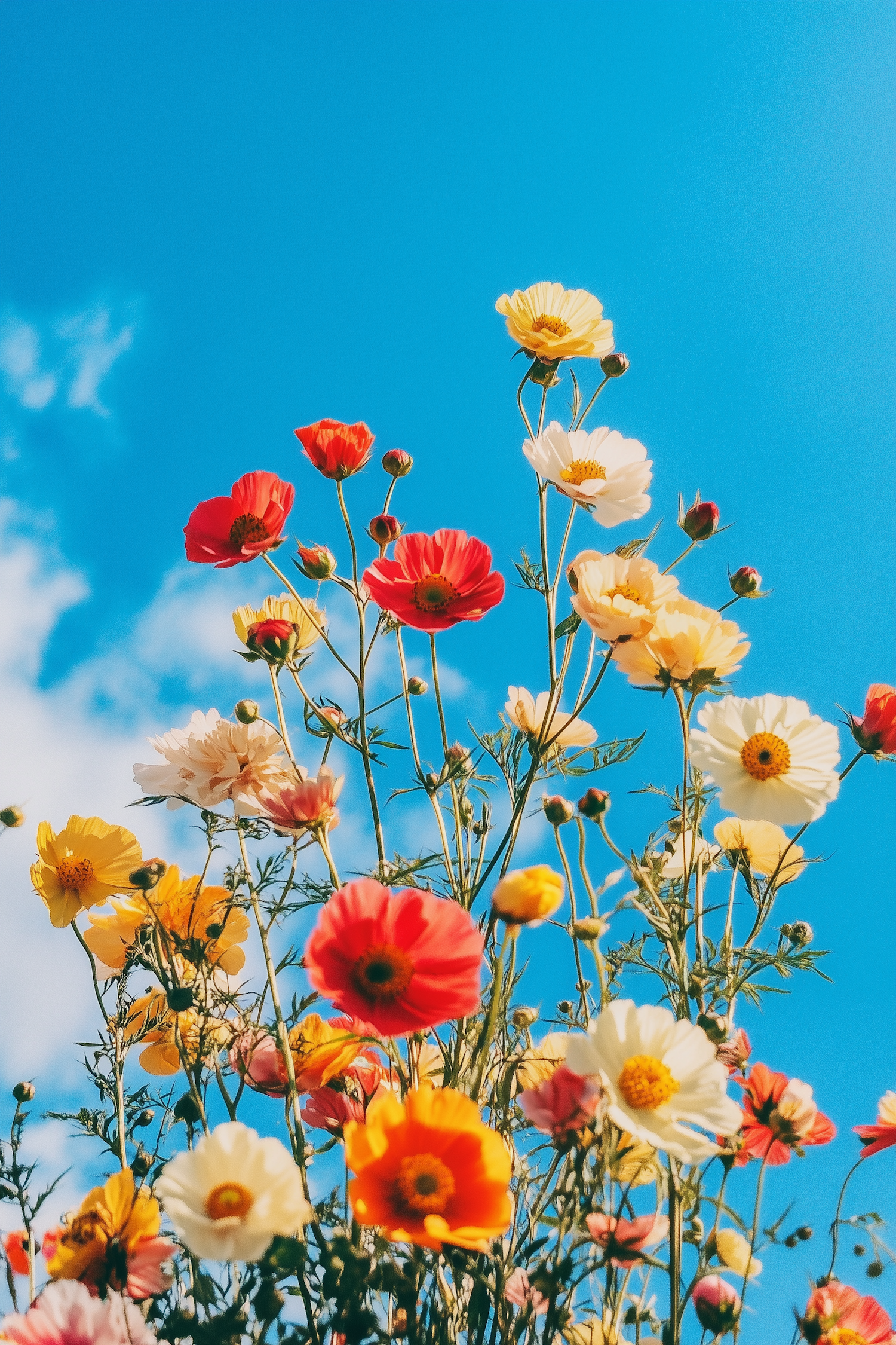 Bright wildflowers in red, yellow, and white bloom against a vivid blue sky, creating a cheerful and vibrant nature scene.