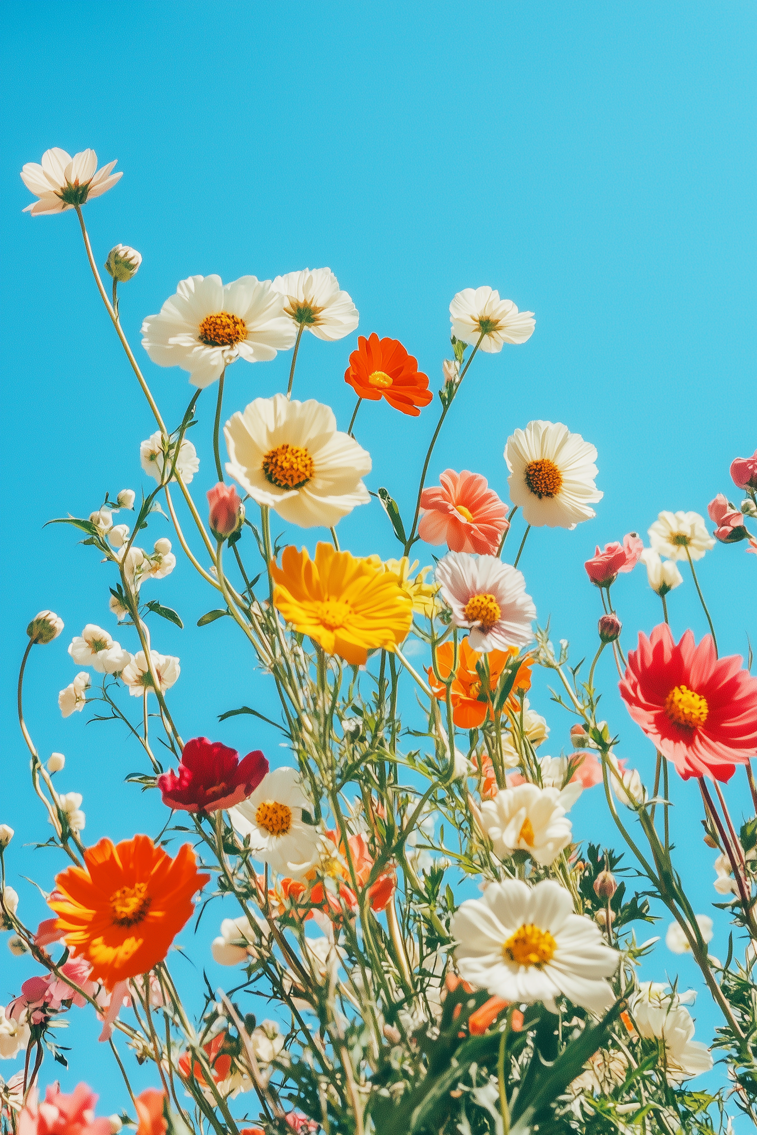 Bright wildflowers in white, yellow, orange, and red bloom against a clear blue sky, creating a vibrant and cheerful nature scene.