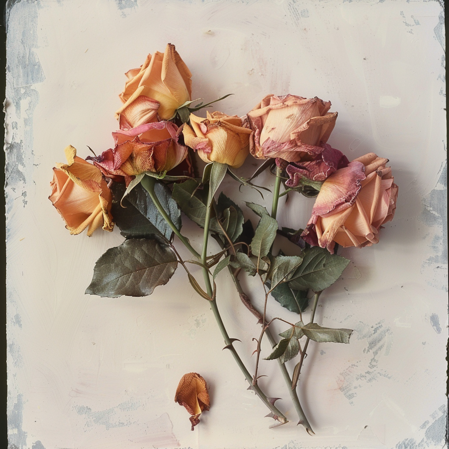 A cluster of wilted roses with faded orange and pink hues on a textured surface, evoking a vintage and melancholic atmosphere.