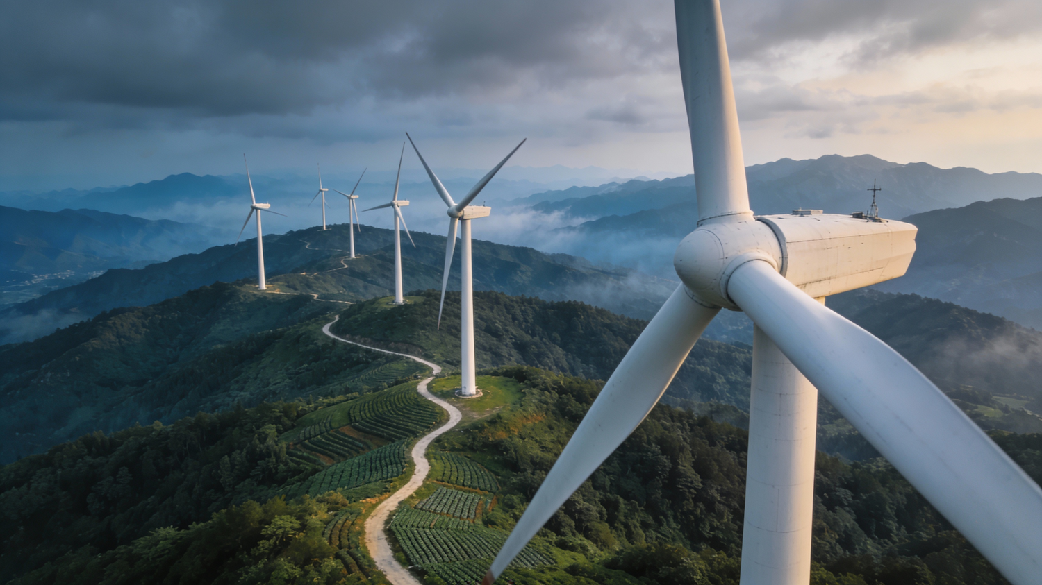 "A cinematic hero banner showcasing a modern wind farm at dawn or dusk with dramatic atmospheric lighting. Wide landscape photograph featuring multiple white wind turbines strategically positioned across rolling green hills with lush vegetation. The turbines should be modern three-blade designs with sleek white towers. Include misty blue-toned mountain ranges layered in the distant background creating depth and scale. The foreground turbine should be prominently positioned on the right side, appearing larger to establish visual hierarchy. Soft diffused natural lighting with a moody overcast sky, creating subtle gradients from slate blue to warm earth tones. The landscape should show sustainable agriculture with visible pathways winding through the terrain. Professional aerial photography perspective at approximately 30-degree angle, capturing both ground detail and sky. Color palette: deep forest greens, soft blues, slate grays, with natural organic tones. Ultra-sharp focus on the foreground turbine with slight depth of field blur on distant elements. Photorealistic quality suitable for a premium renewable energy company website hero section in 16:9 widescreen format.
