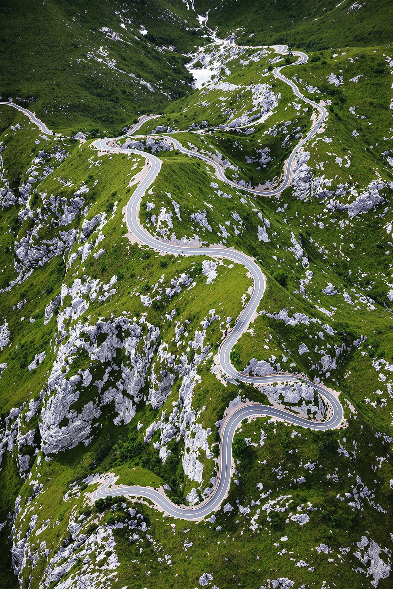 Aerial view of a winding mountain road through lush green hills with white rocky outcrops, creating a stunning natural and engineered landscape.