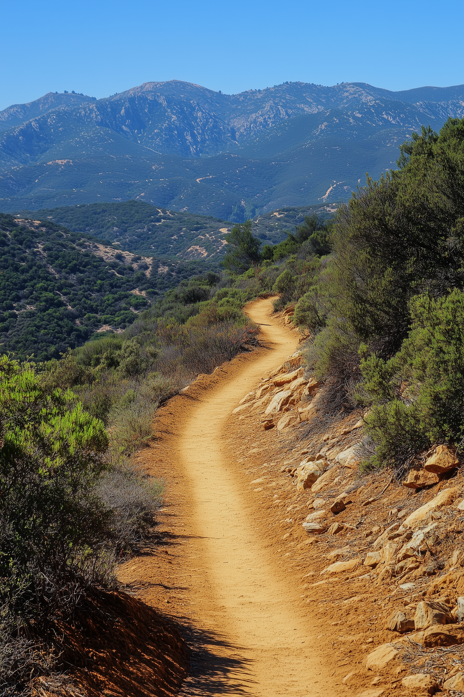 Winding dirt trail through lush green shrubs and rocky terrain, leading to distant mountains under a clear blue sky.