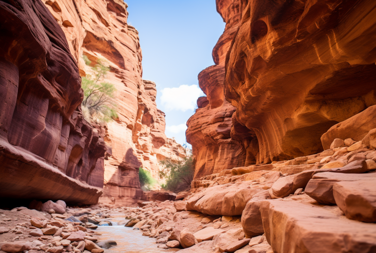 Majestic red rock canyon with a winding stream, vibrant textures, and clear blue sky. Perfect for nature and adventure enthusiasts.