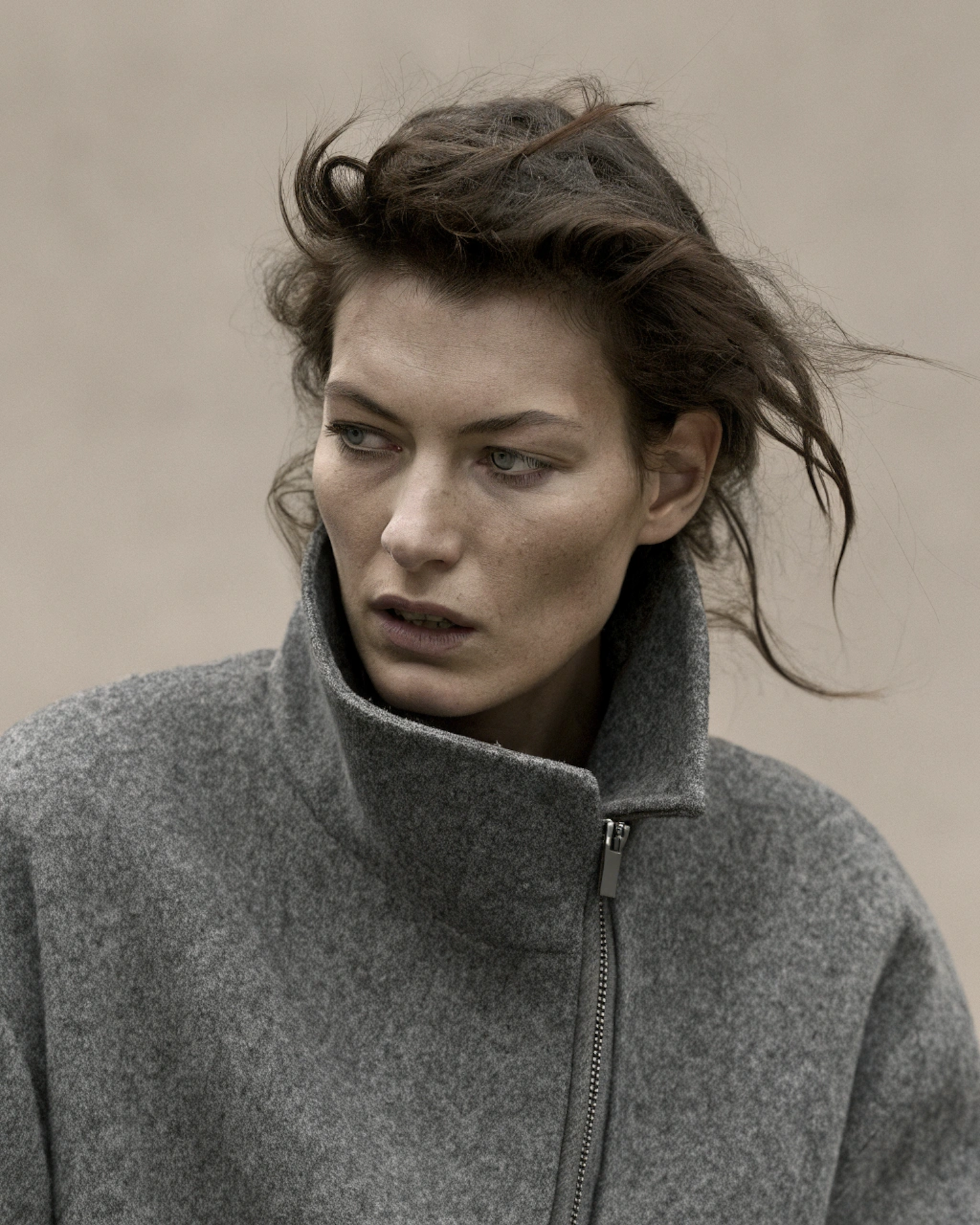 A woman with piercing blue eyes and messy dark hair wears a gray wool jacket, looking contemplative against a muted beige background.