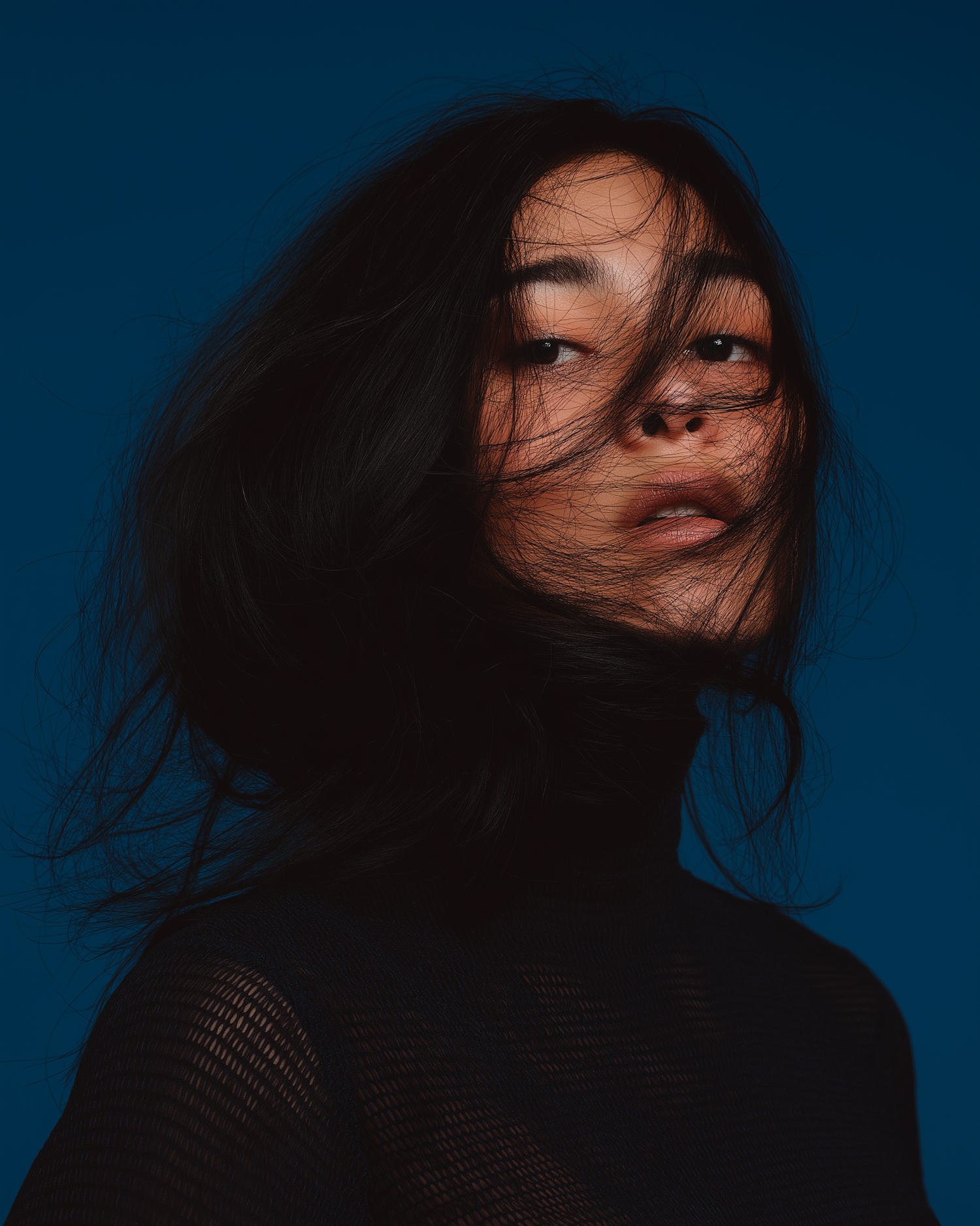 Close-up of an Asian woman with windswept dark hair, wearing a black turtleneck against a deep blue background.