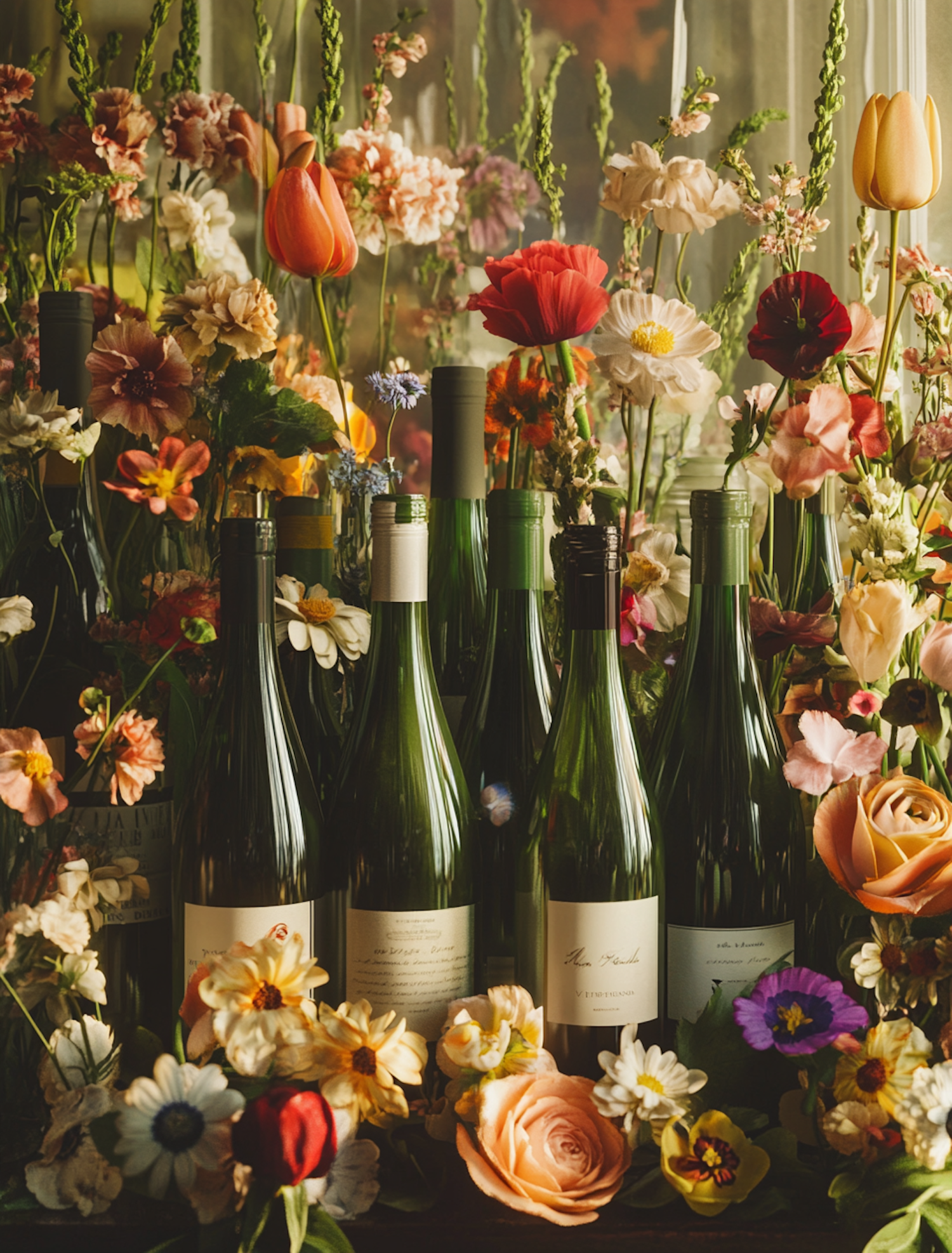 Wine bottles surrounded by vibrant flowers, including tulips and roses, creating a lush and colorful display.