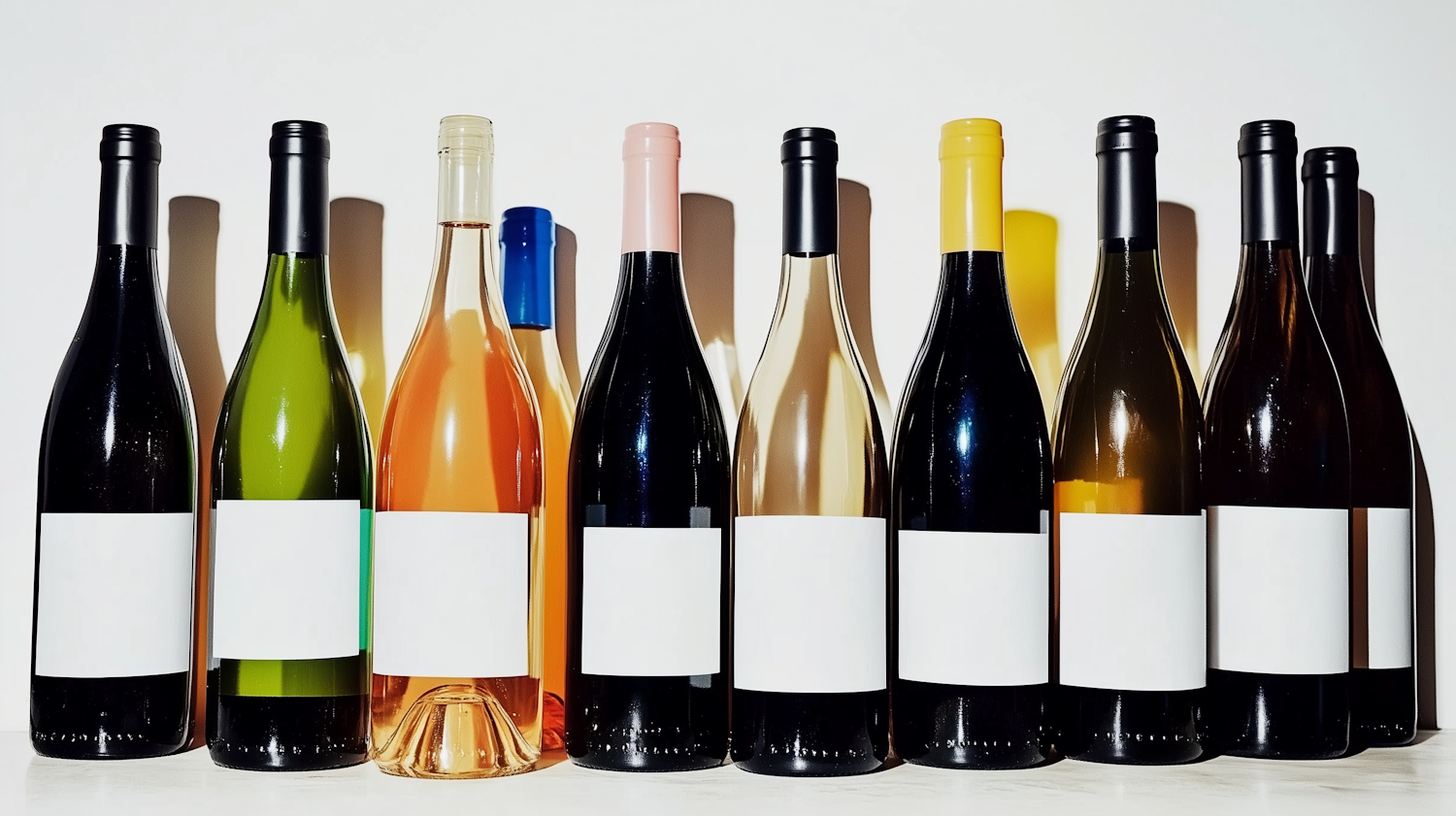 A neat row of wine bottles with blank labels, featuring diverse glass colors and caps, set against a clean white background.