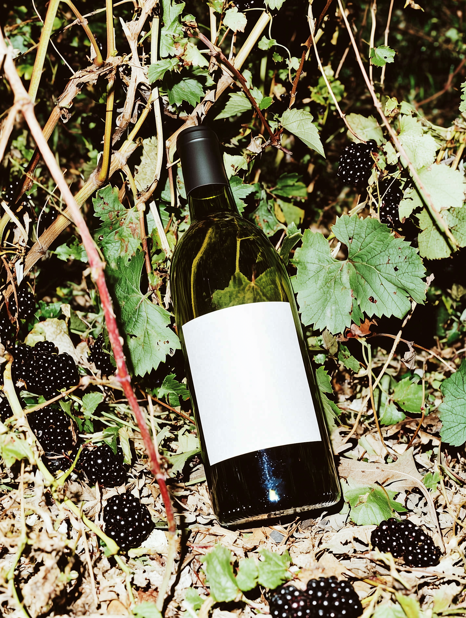 A wine bottle with a blank label rests among blackberry vines, surrounded by ripe berries and green leaves in a rustic outdoor setting.