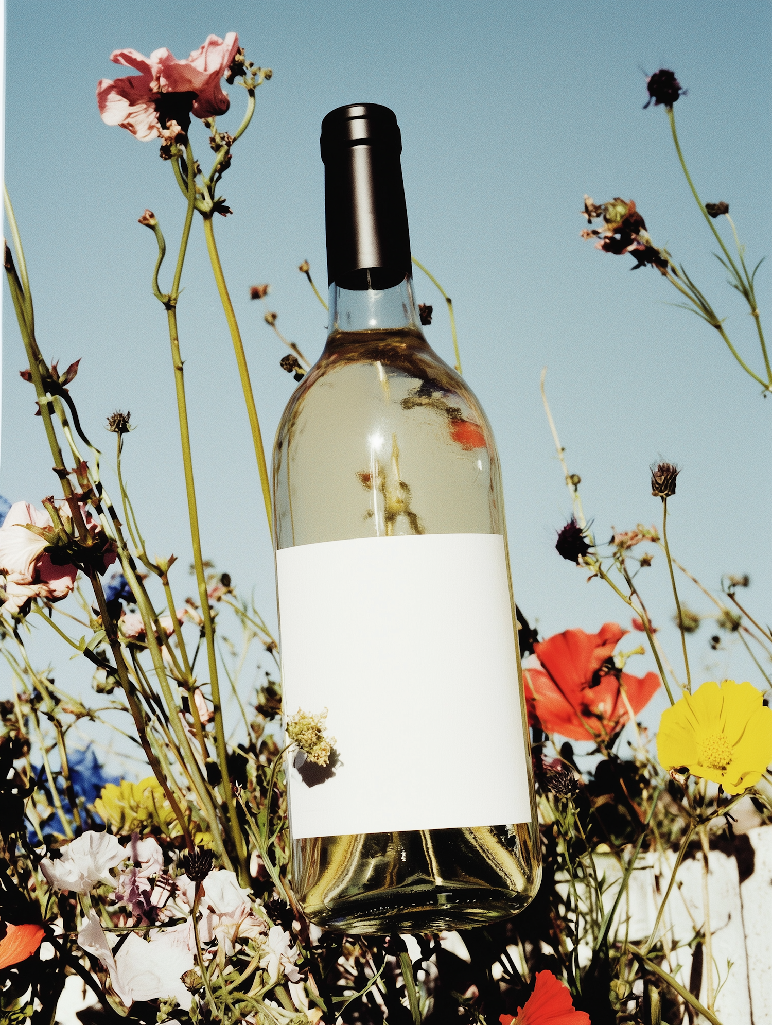 A wine bottle with a blank label surrounded by colorful wildflowers under a clear blue sky, creating a vibrant and natural aesthetic.