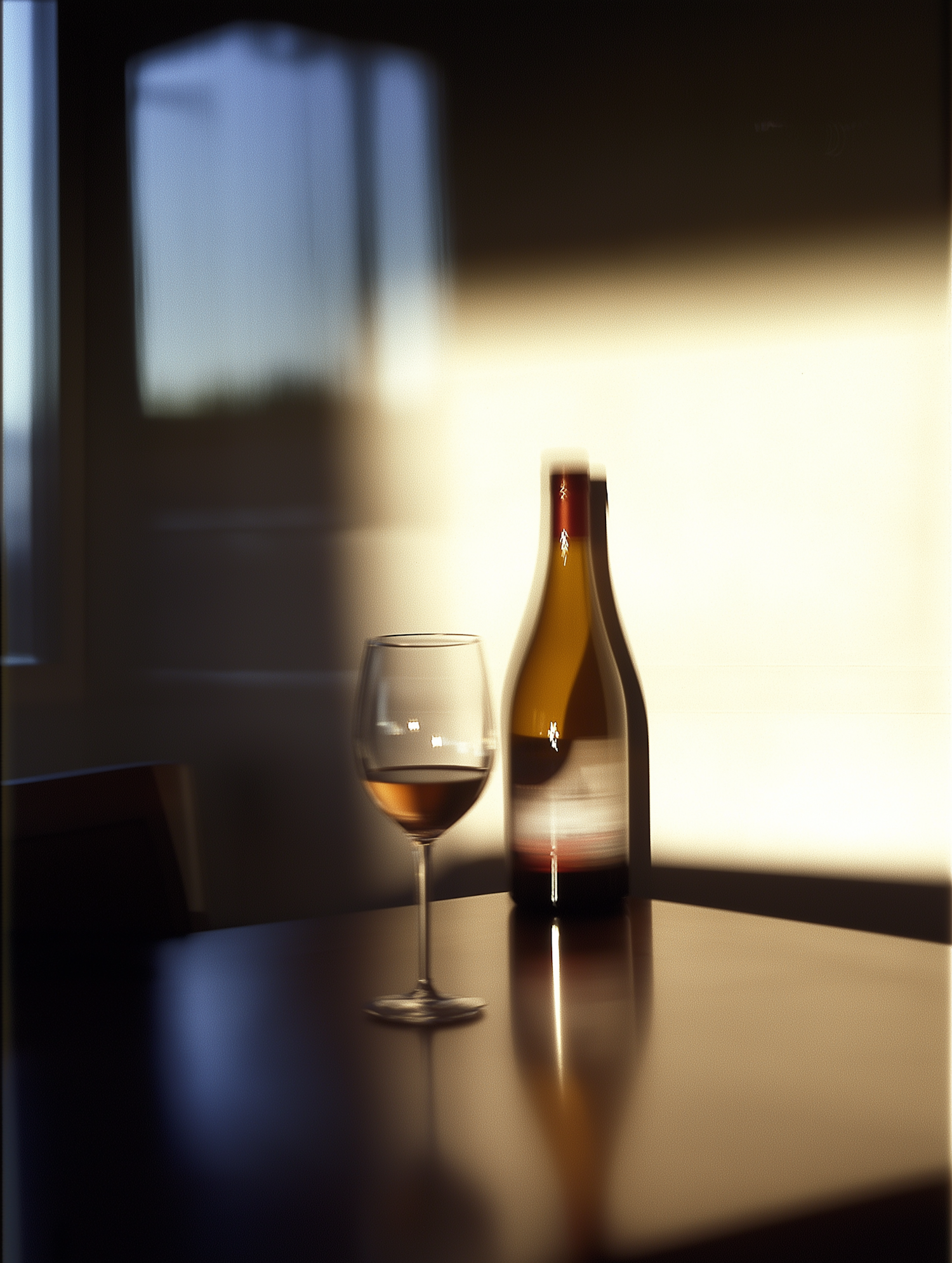 Elegant wine glass and bottle on a wooden table, bathed in warm, golden light, creating a serene and sophisticated atmosphere.